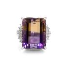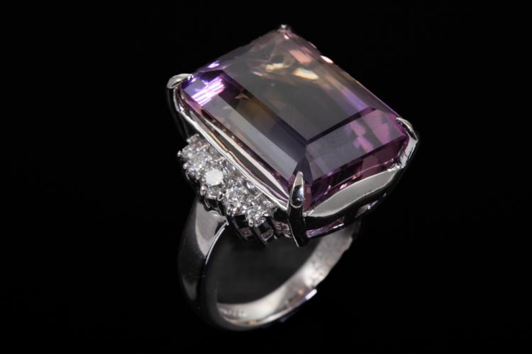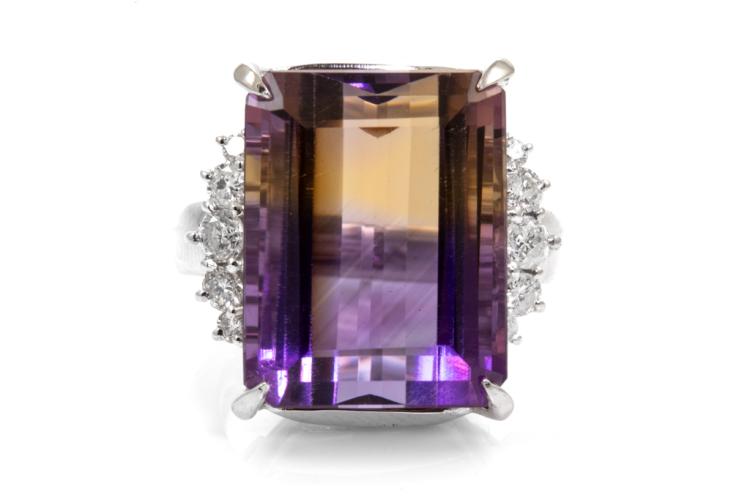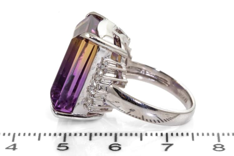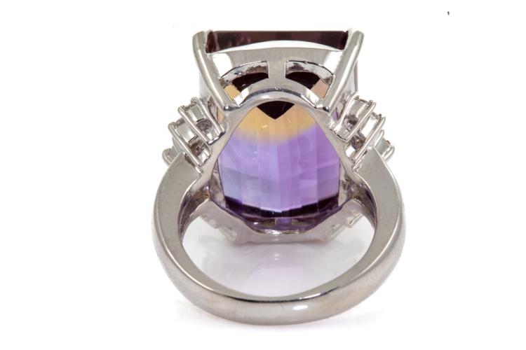 Ametrine and Diamond ring with emerald cut Natural Ametrine of 20.62ct and round Natural Diamonds totalling 0.53cts (Estimated grading: H SI-P2). Platinum - 900. Ring size L. Weight: 19.1g. (Pre-owned)