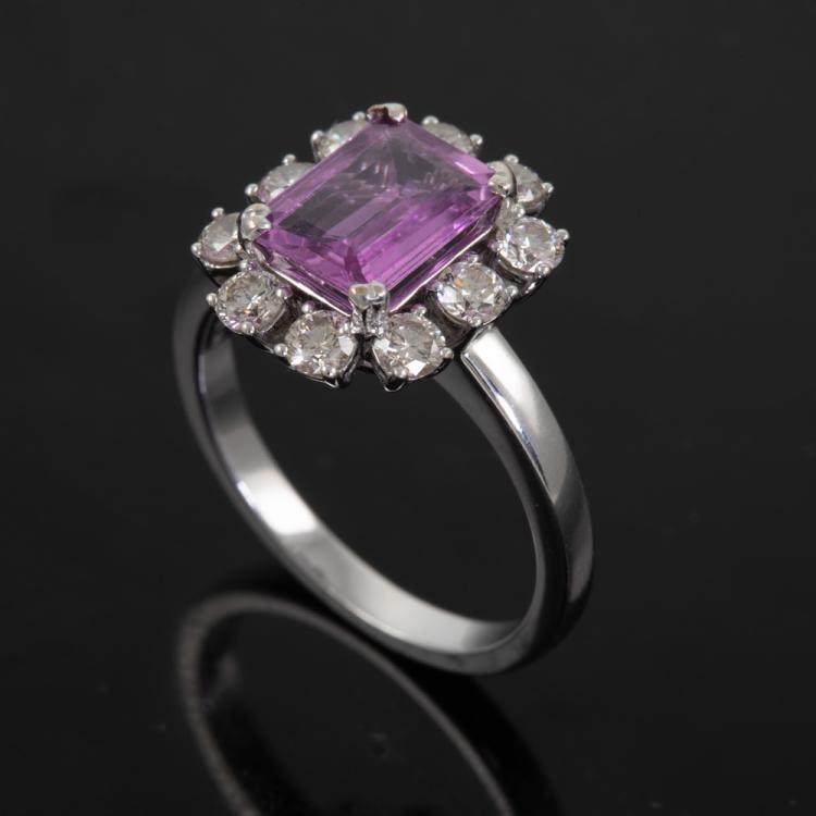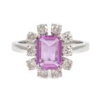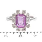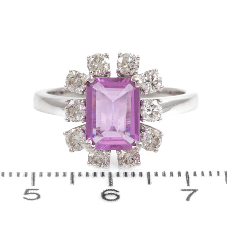 Sapphire and Diamond ring with an emerald cut pink natural Sapphire of 2.10ct and round natural Diamonds totalling 0.99cts (Estimated grading: K SI). 18ct white gold. Ring size P. Band width: 2.2mm-2.4mm. Weight: 6.2g. (New)