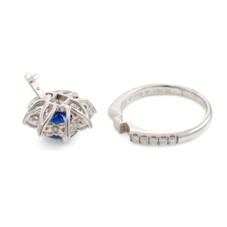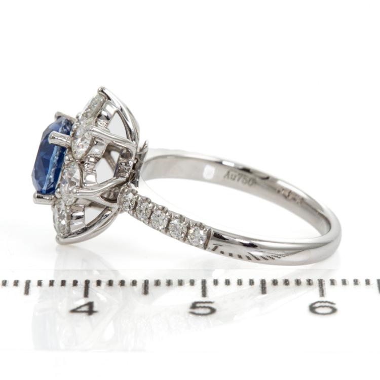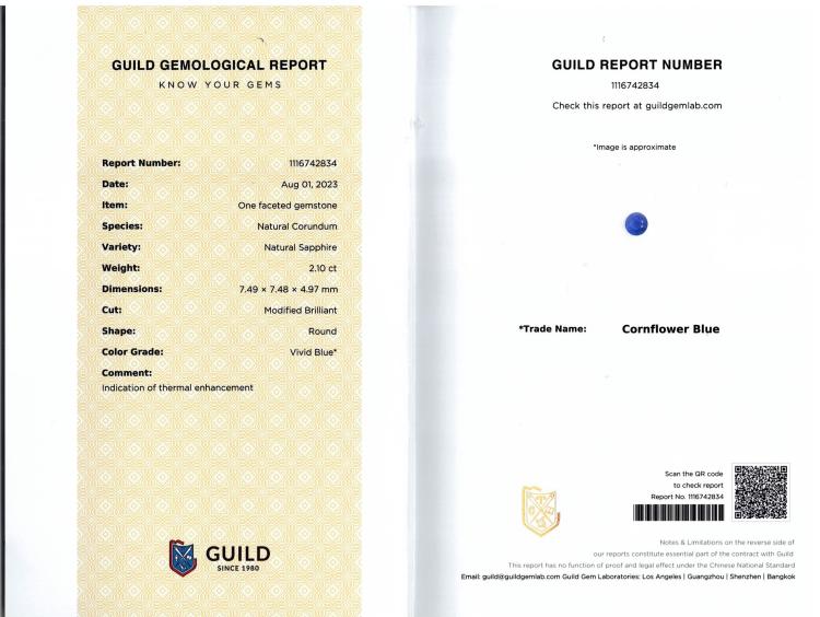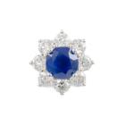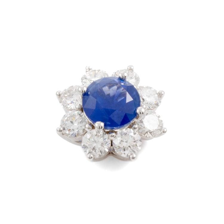Sapphire and Diamond detachable ring with a round natural cornflower blue Sapphire of 2.10cts (With Guild Gemological Report #116742834) and 8 round natural Diamonds totalling 1.60cts (Estimated grading: F-G VS-SI) and 10 round Diamonds set on band totalling 0.30cts. 18ct white gold. Ring size M 1/2. Band width: 2.3mm - 2.4mm. Weight: 6.5g. Note - the detachable top can be convented to a pendant. (Pre-owned)