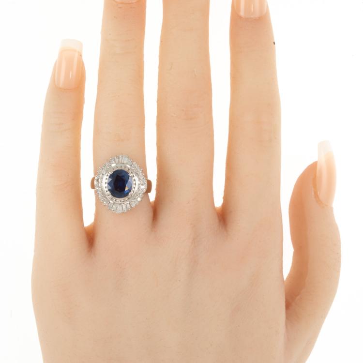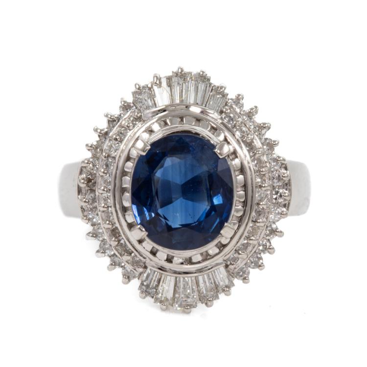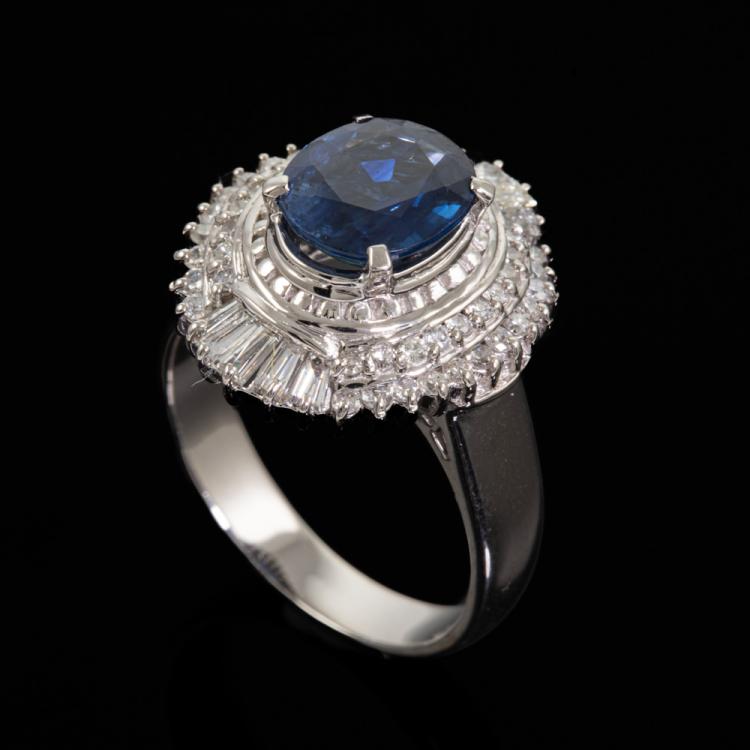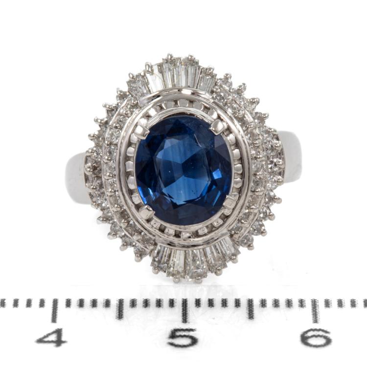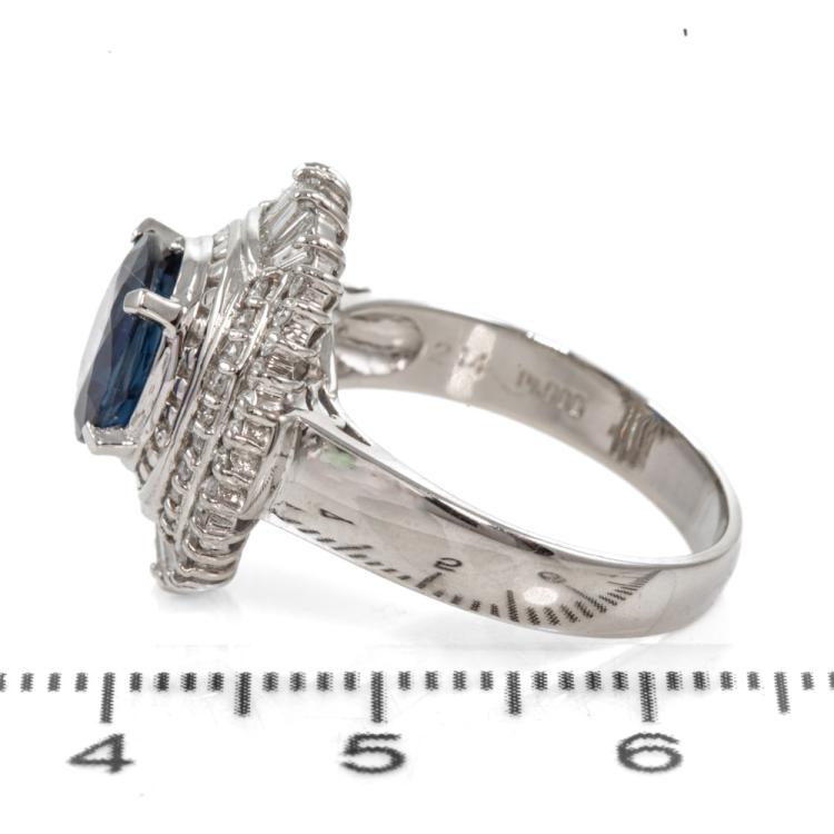 Sapphire and Diamond ring with an oval shape blue Natural Sapphire of 2.14ct and round & baguette cut Natural Diamonds totalling 0.81cts (Estimated grading: G-H SI-P1). Platinum 900. Ring size M. Band width: 3.2mm-4.5mm. Weight: 10.0g. (Pre-owned)