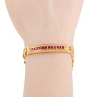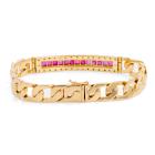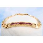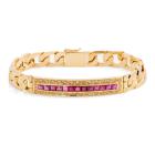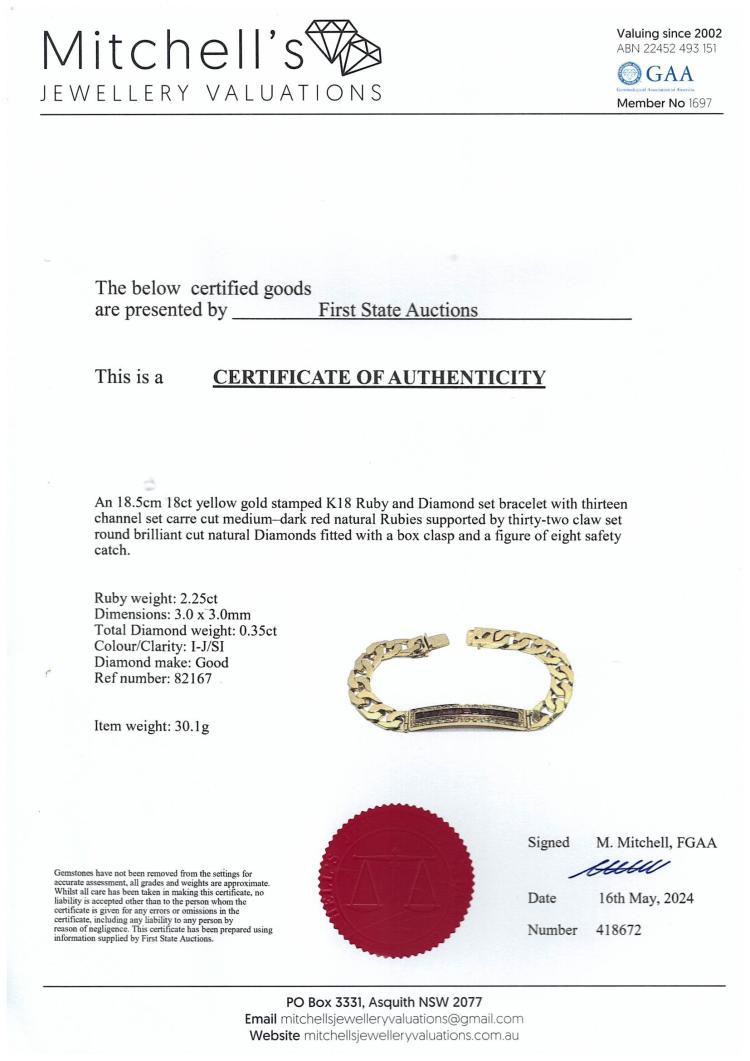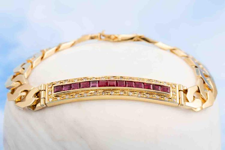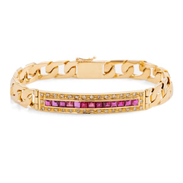 Ruby and Diamond bracelet with care cut natural Rubies totalling 2.25ct and round natural Diamonds totalling 0.35ct (Estimated grading: I-J SI). 18ct yellow gold. Length: 18.5cm. Weight: 30.1g. With Certificate #418672 (Pre-owned)