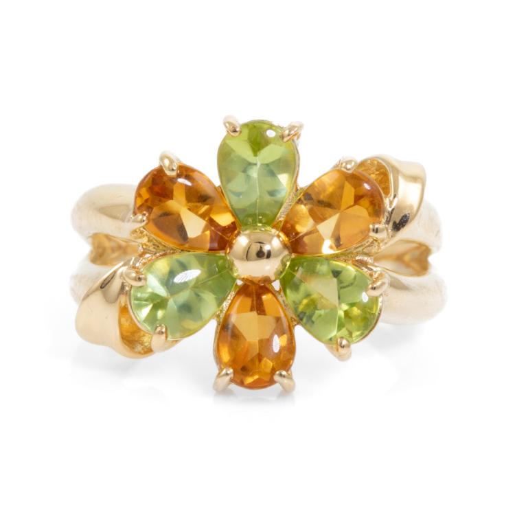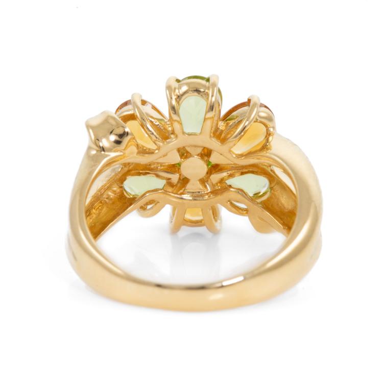 Peridot and Citrine ring with pear shape cabochon natural Peridot totalling 1.26cts and pear shape cabochon Natural Citrines totalling 1.03cts. 18ct yellow gold. Ring size I1/2 - ring resizing is not recommended. Weight: 5.1g. (Pre-owned)