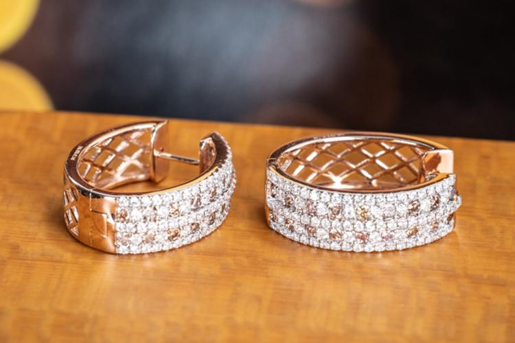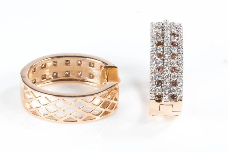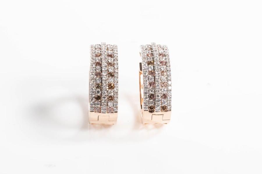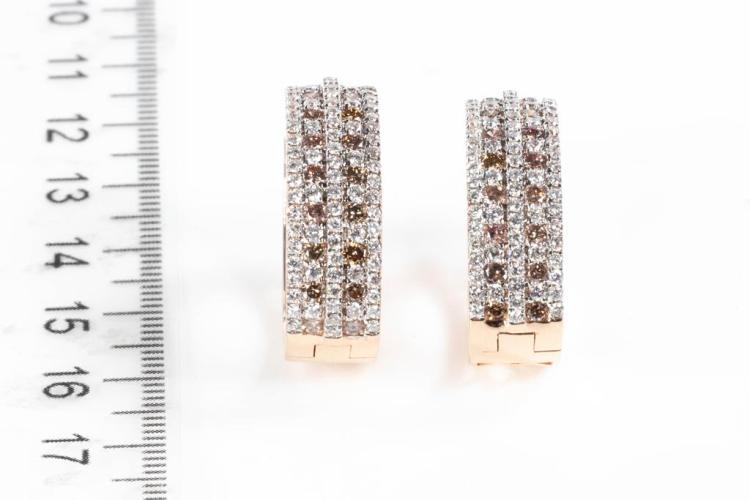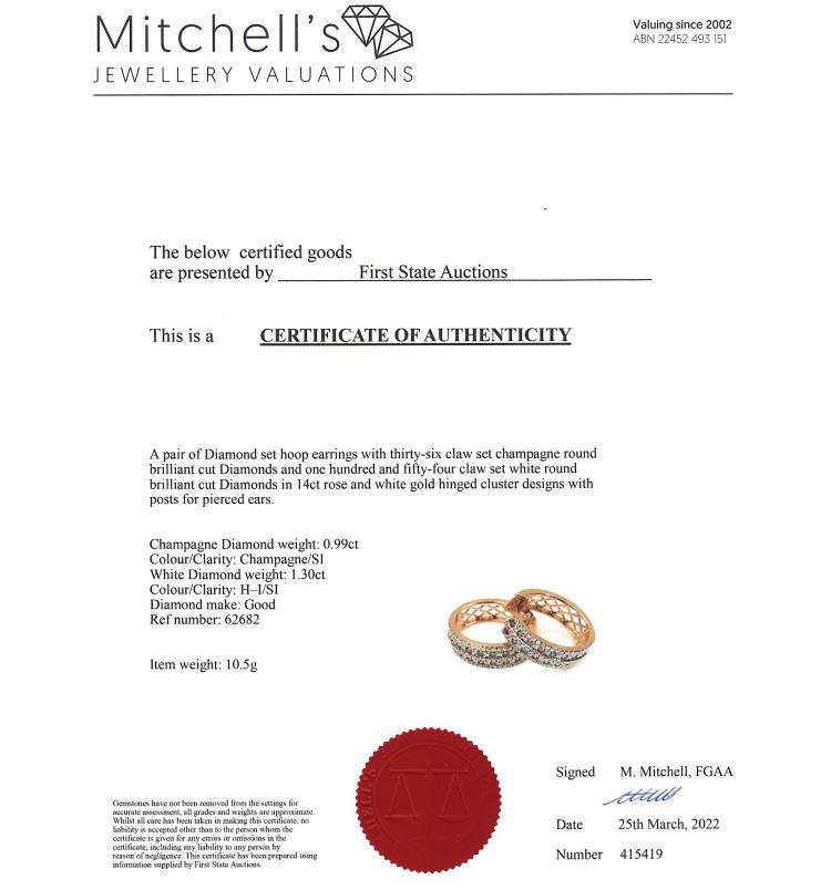 Diamond hoop earrings with round Champagne Natural Diamonds totalling 0.99ct (Estimated grading: Champagne SI) and round white Natural diamonds totalling 1.30ct (Estimated grading: H-I SI). 14ct white & rose gold. Weight: 10.5g With Certificate #415419. (As New)