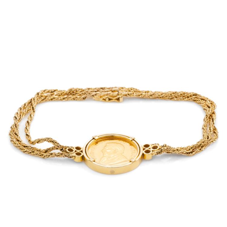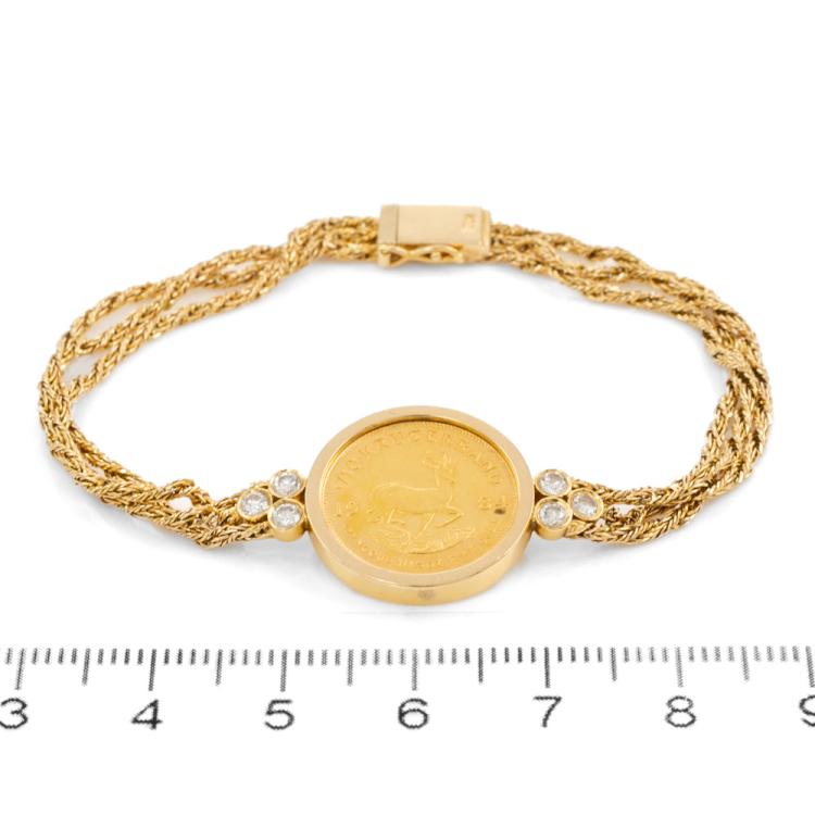 South African Coin bracelet with 1984 South Africa Gold bullion Coin (stamped Krugerrand) 1/10 OZ and round Natural Diamonds totalling approximately 0.40cts (Estimated grading G-H SI). 22ct yellow gold coin (XRF tested) with 14ct yellow gold setting and bracelet. Length: 17cm. Weight: 10.8g. (Pre-owned)