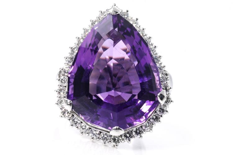 Amethyst and Diamond ring with fancy pear shape natural Amethyst of 24.28ct and round natural Diamonds totalling 1.17ct (Estimated grading: G SI). Platinum - 900. Ring size M - ring resizing is not recommended. Weight: 19.0g. (Pre-owned)