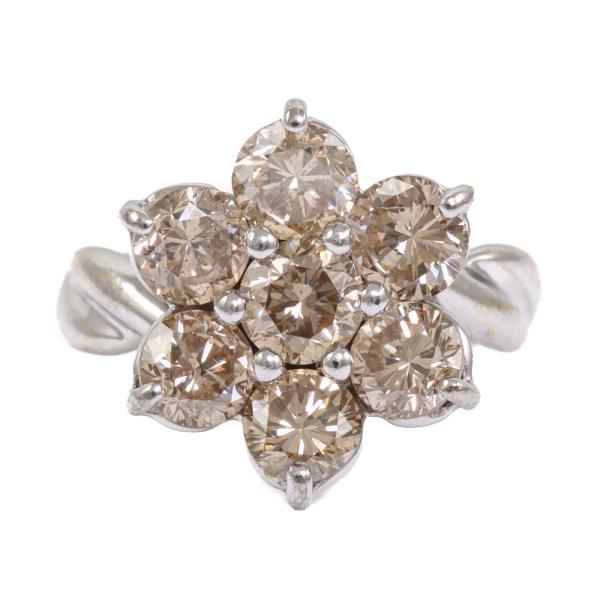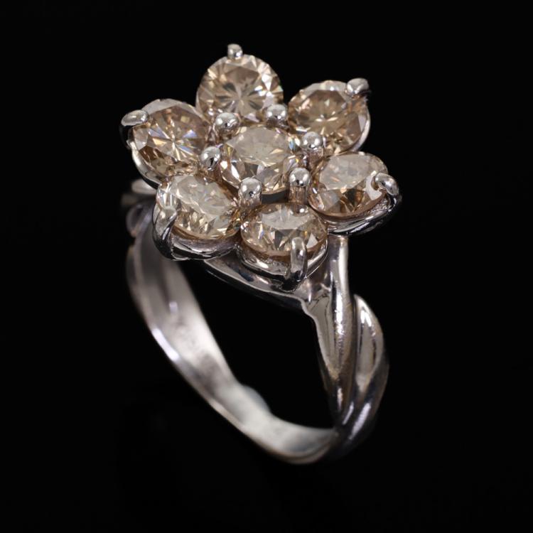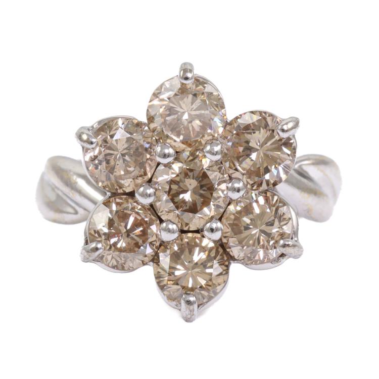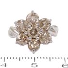 Diamond Flower Design ring with round Natural Diamonds totalling 2.50ct (Estimated grading: Fancy Light Brown SI) 18ct white gold. Ring size: H. Band width: 2.0mm-3.8mm. Weight: 5.3g. (Pre-owned)