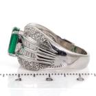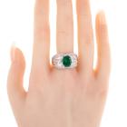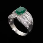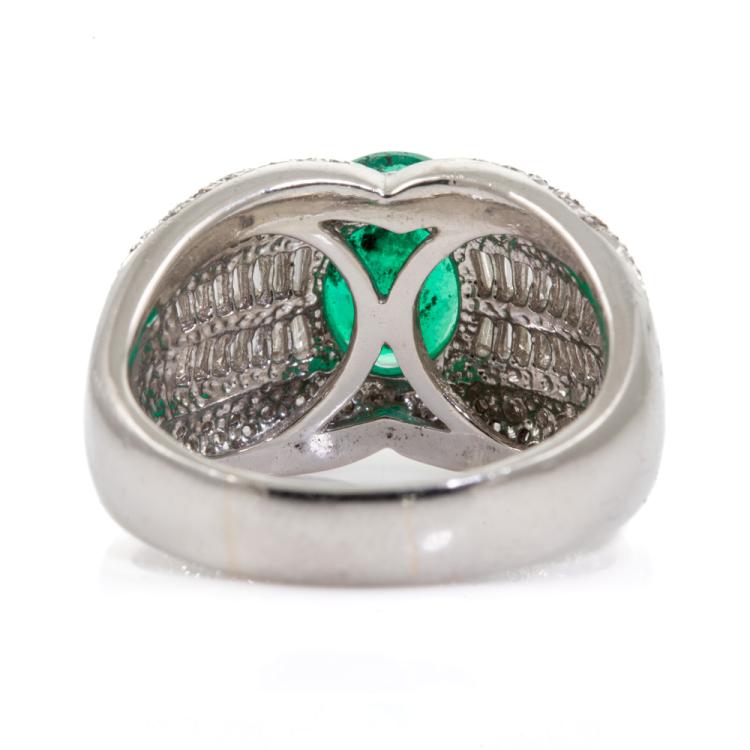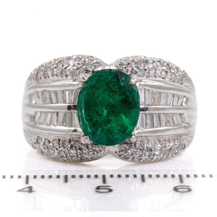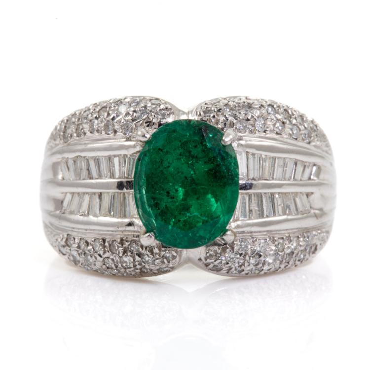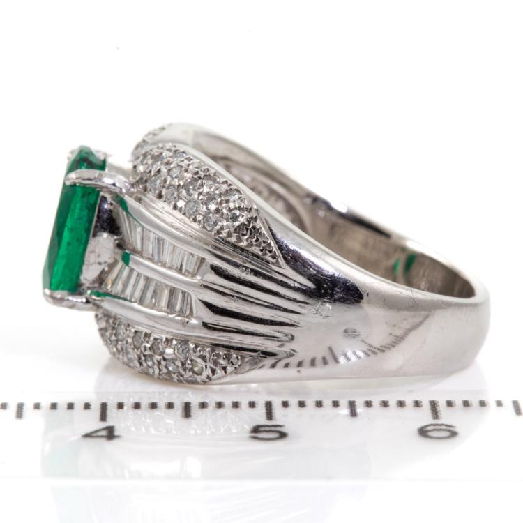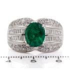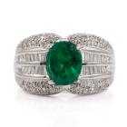 Emerald and Diamond ring with an oval shape Natural Emerald of 2.65ct and round & baguette cut Natural Diamonds totalling 1.20ct (Estimated grading: G-H SI). Platinum - 900. Ring size R3/4 - ring resizing is not recommended. Band width: 7.8mm - 4.6mm. Weight: 19.4g. With Certificate #415647. (Pre-owned)