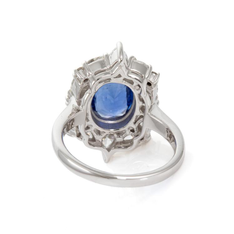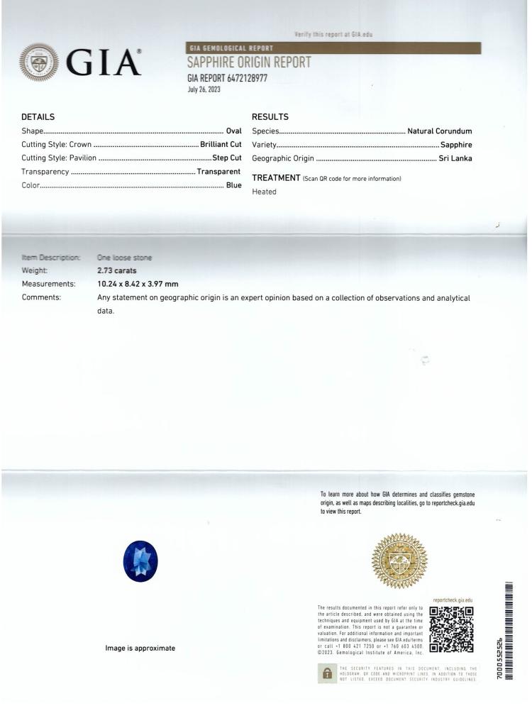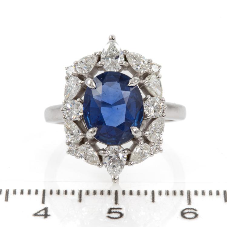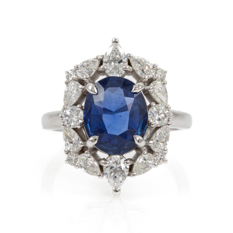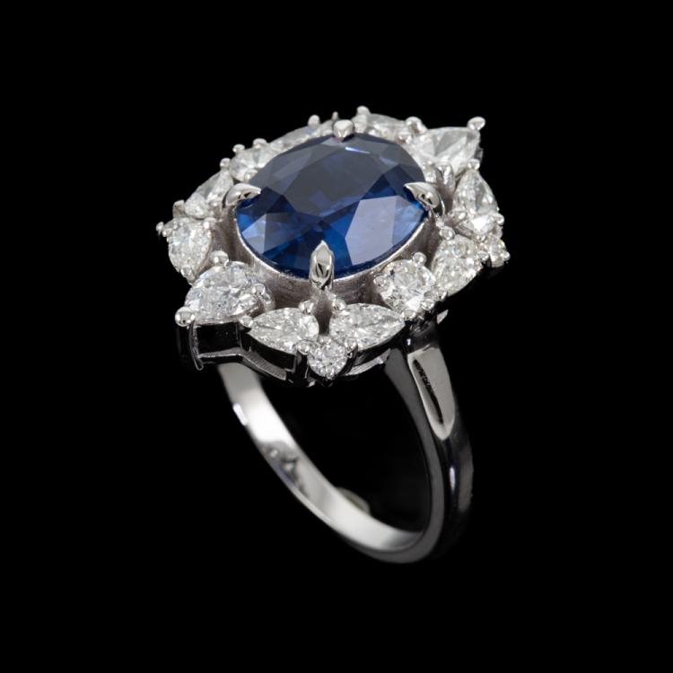 Sapphire and Diamond ring with oval shape natural Sri Lankan blue Sapphire of 2.73ct (with GIA Report of origin #6472128977) and round & pear shape Natural Diamonds totalling approximately 1.53cts (Estimated grading: G-H VS-SI). 18ct white gold. Ring size M½. Band width: 1.9mm - 2.7mm. Weight: 7.5g (Pre-owned)