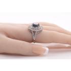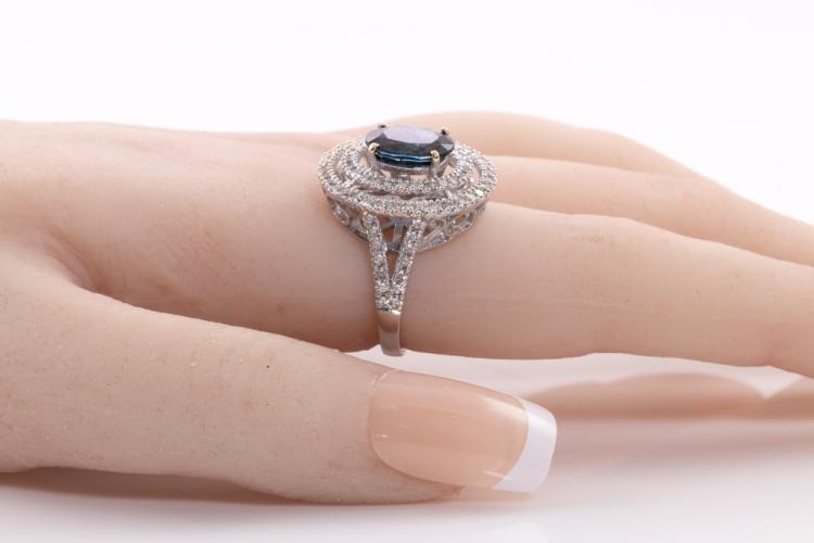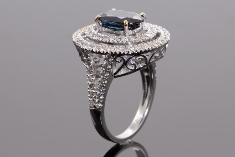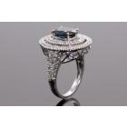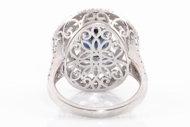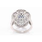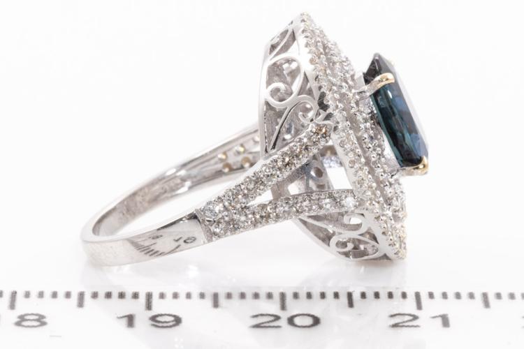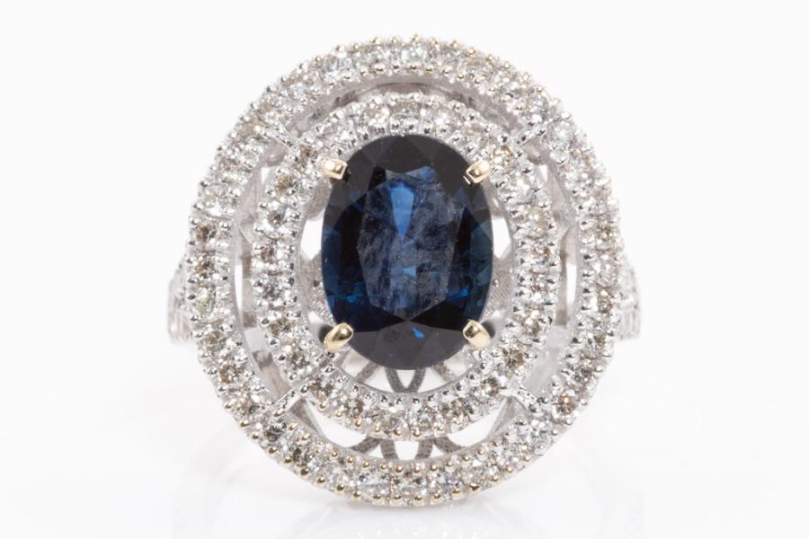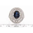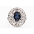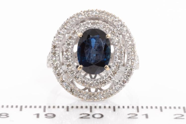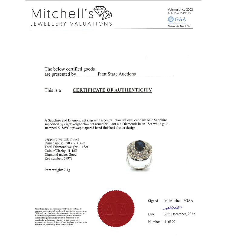 Sapphire and Diamond ring with oval blue Sapphire of 2.88ct and round natural Diamonds totalling 1.13ct (Estimated grading: H-I SI). 18ct white gold. Ring size N. Weight: 7.1g. With Certificate #416500. (Pre-owned)
