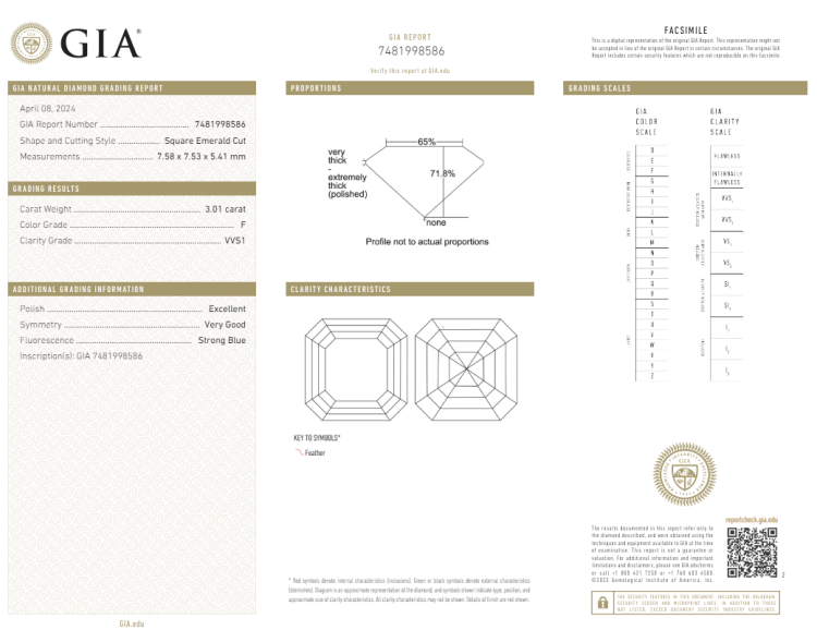 A loose square emerald cut Natural Diamond of 3.01ct (with GIA report graded as F VVS1 #7481998586). (New)