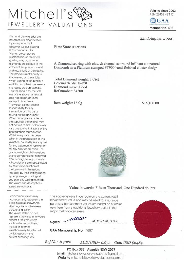 Diamond dress Ring with round Natural Diamonds totalling approximately 3.08ct. (Estimated grading: H-I SI). Platinum-900. Ring size: K½. Band width: 2.9mm. Weight: 16.0g. With Valuation Certificate #419020. (Pre-owned)