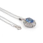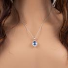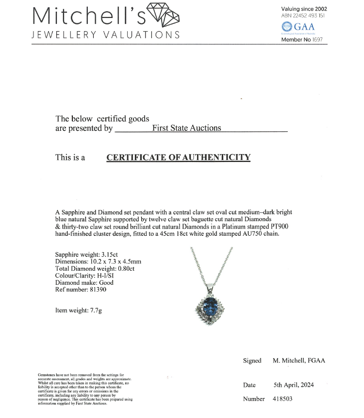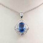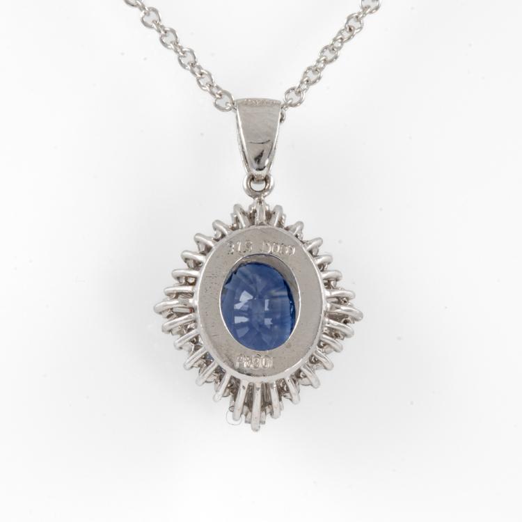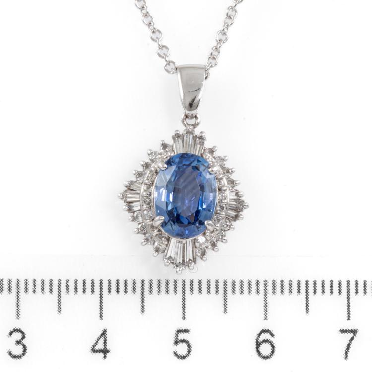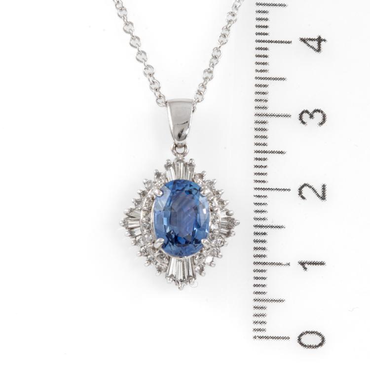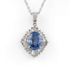 Sapphire and Diamond pendant with oval shape Natural blue Sapphire of 3.15ct and round & baguette cut Natural Diamonds totalling 0.80cts (Estimated grading: H-I SI). Platinum 900 with 18ct white gold 45cm chain. Weight: 7.7g. With Certificate 418503. (Pre-owned)