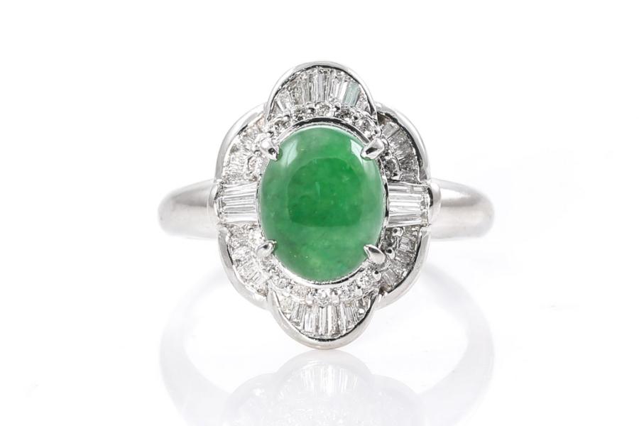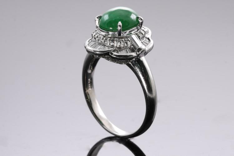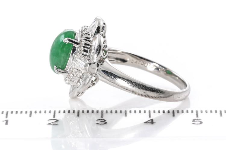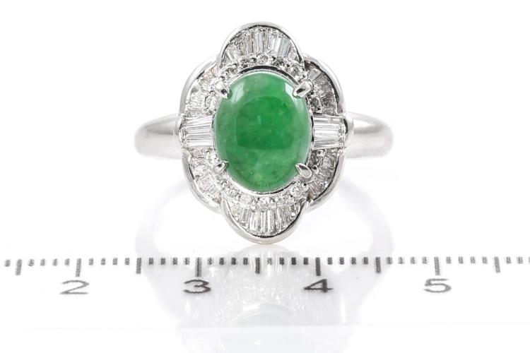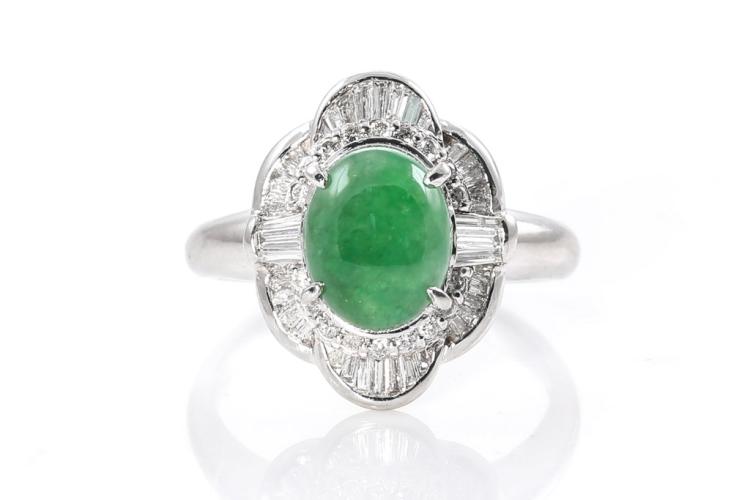 Jade and Diamond ring with oval cabochon cut green Natural green Jadeite Jade - Type A of 3.41ct and baguette & round natural Diamonds totalling 0.67cts (Estimated grading: G-H SI). Platinum. Ring size S. Weight: 11.1g. (Pre-owned)