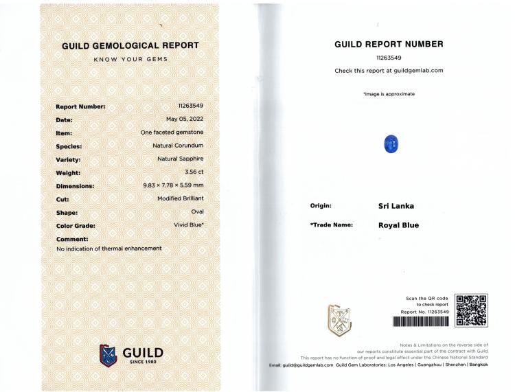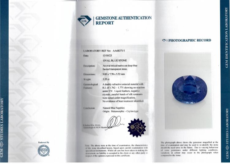 A loose oval shape natural blue Sapphire of 3.55ct (with GSL Gemstone Report #AA68371/1 graded as unheated Ceylon type & GUILD Report #11263549 graded as 3.56ct unheated Sri Lanka Royal blue). (As New)