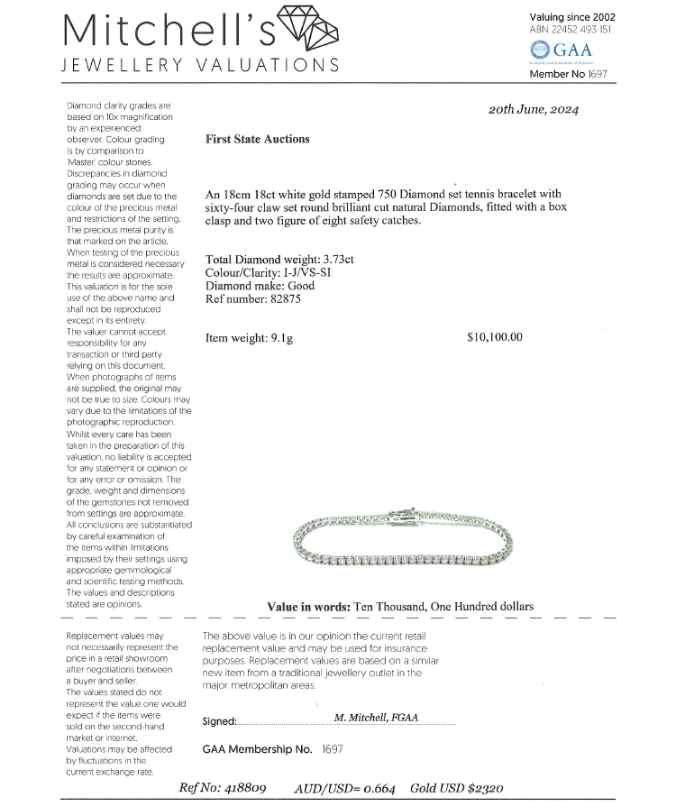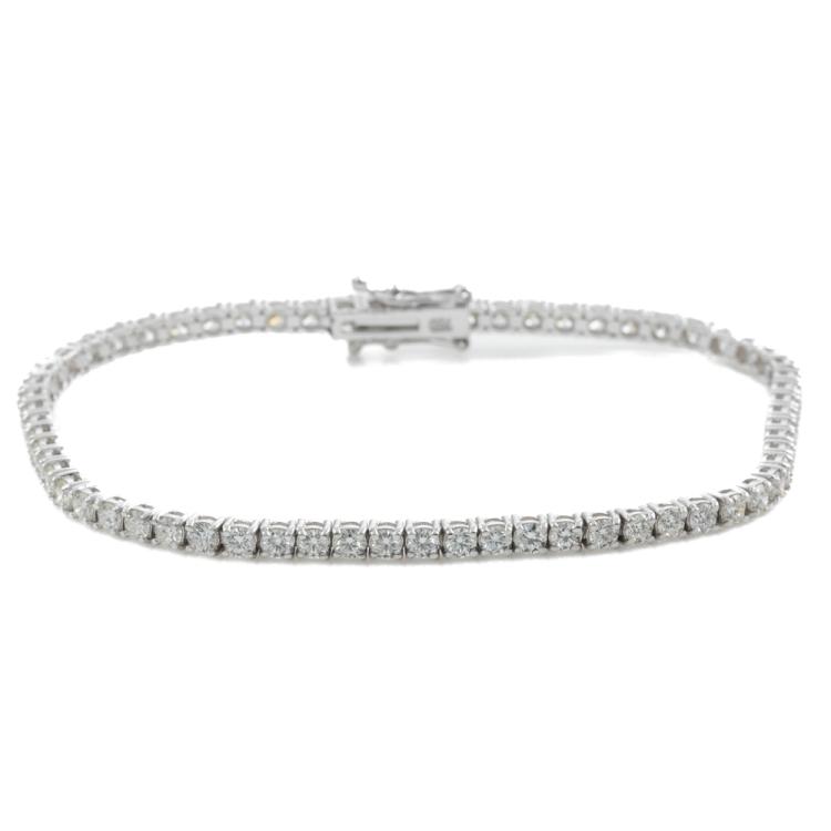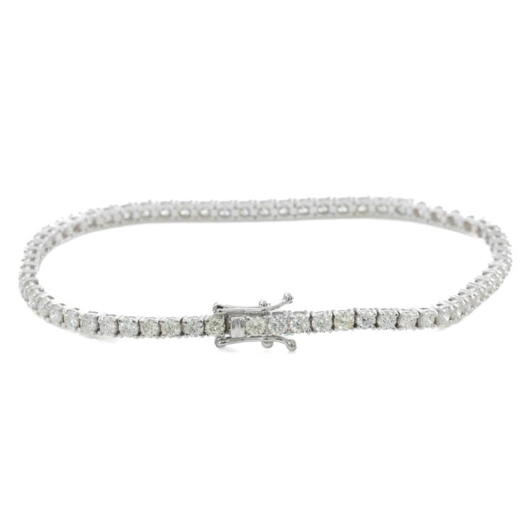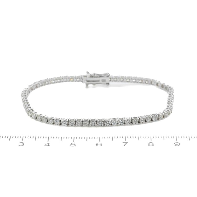 Diamond tennis bracelet with 64 round brilliant natural Diamonds totalling 3.73ct (Estimated grading: I-J VS-SI). 18ct white gold. Length: 18cm. Weight: 9.1g. With Valuation Certificate #418809. (New)