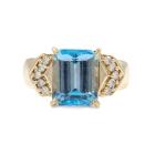Topaz and Diamond ring with emerald cut Natural blue Topaz of 3.78ct and round Natural Diamonds totalling approximately 0.15ct. 18ct yellow gold. Ring size L. Band width: 2.5mm - 5.3mm. Weight: 6.1g. (Pre-owned)