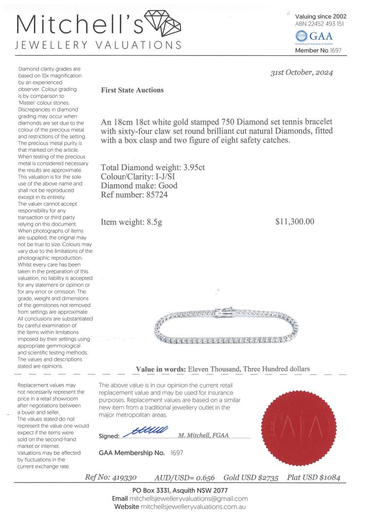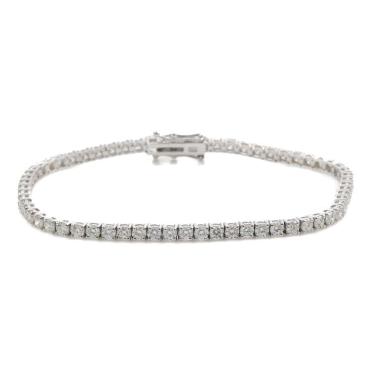 Diamond tennis bracelet with 64 round Natural Diamonds totalling 3.95ct (Estimated grading: I-J SI). 18ct white gold. Length: 18cm. Weight: 8.5g. With Valuation Certificate #419330. (New)