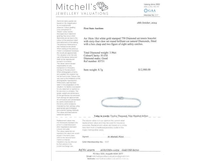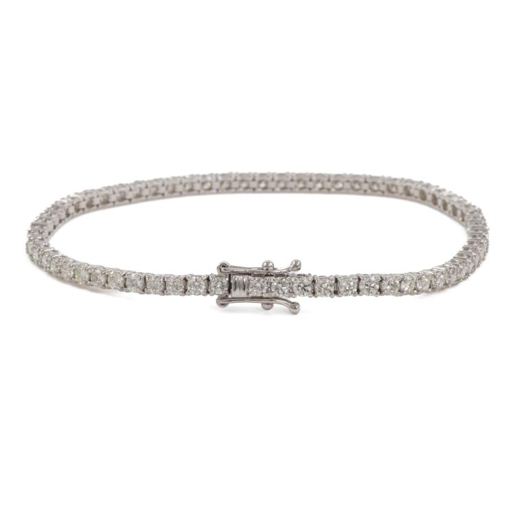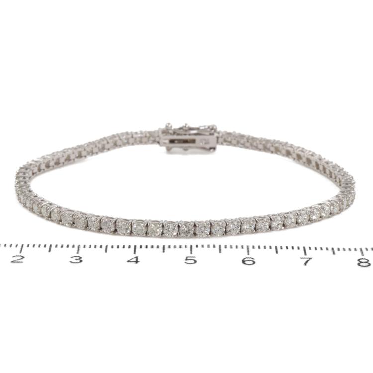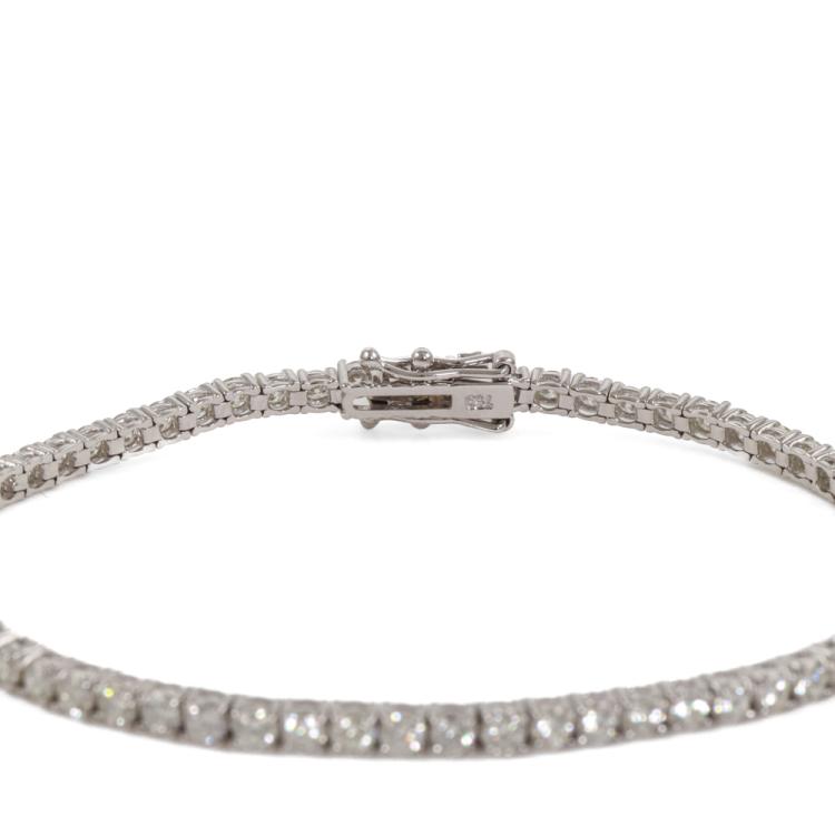 Diamond tennis bracelet with 64 round diamonds totalling 3.96ct (Estimated grading: H-I SI). 18ct white gold. Length: 18cm. Weight: 8.7g. With Valuation Certificate #419279. (New)