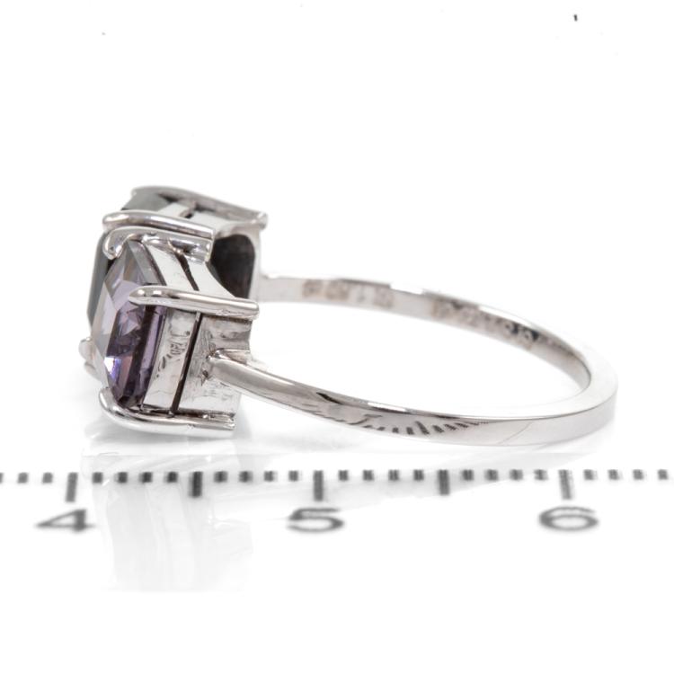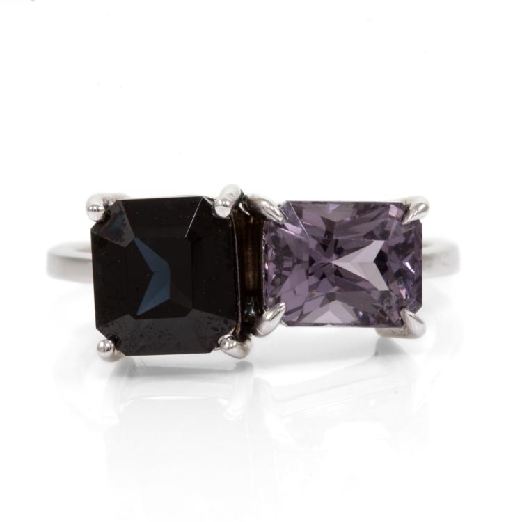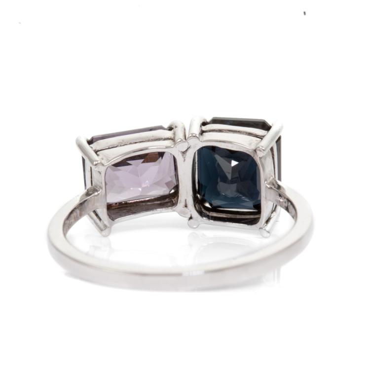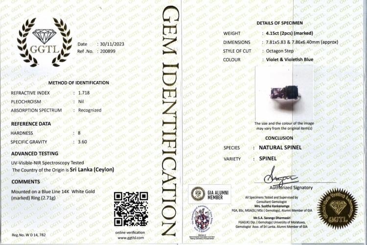 Spinel ring with 2 octagonal step cut violet and dark violetish blue Natural Ceylon Spinel totalling 4.15cts. 14ct white gold. Ring size K. Band width: 1.4mm. Weight: 2.7g. With GGTL report #200899. (As new)^