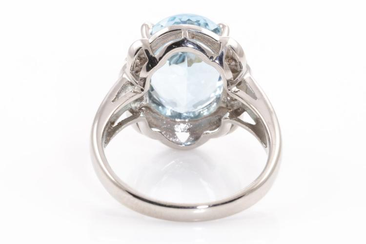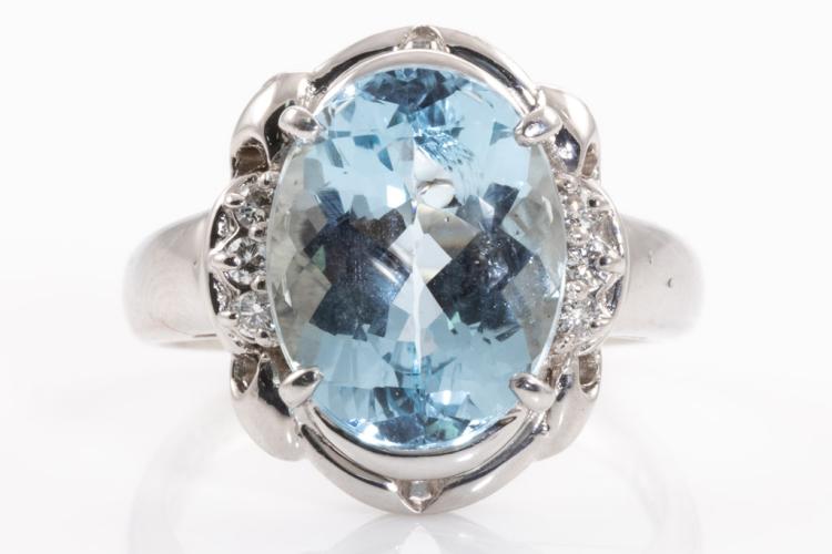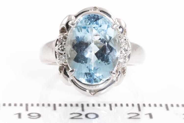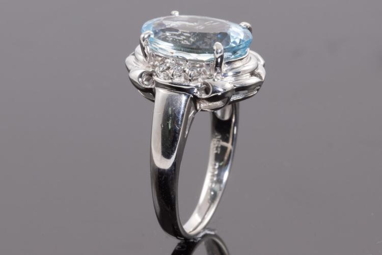 Aquamarine and Diamond ring with oval shape natural Aquamarine of 4.53ct and round natural Diamonds totalling 0.09cts. Platinum-900. Ring size L1/2. Weight: 7.6g. (Pre-owned)