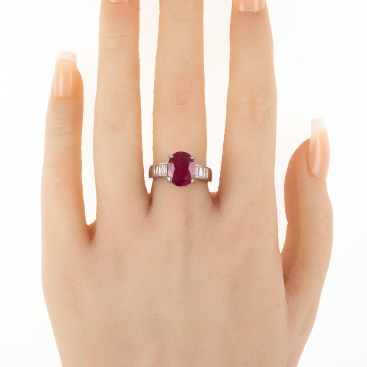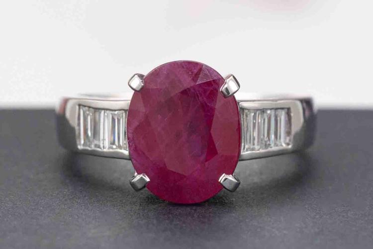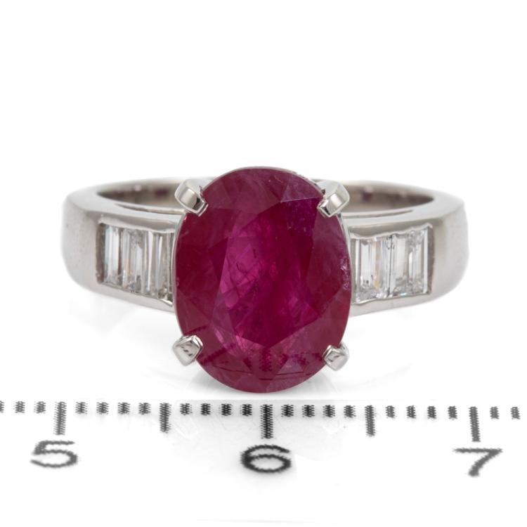 Ruby and Diamond ring with oval natural Ruby of 4.54ct and baguette cut natural Diamonds totalling 0.39ct (Estimated grading: H-I VS). Platinum-900. Ring size: M. Band width: 2.9mm - 4.4mm. Weight: 8.6g. With Certificate 418668. (Pre-owned)