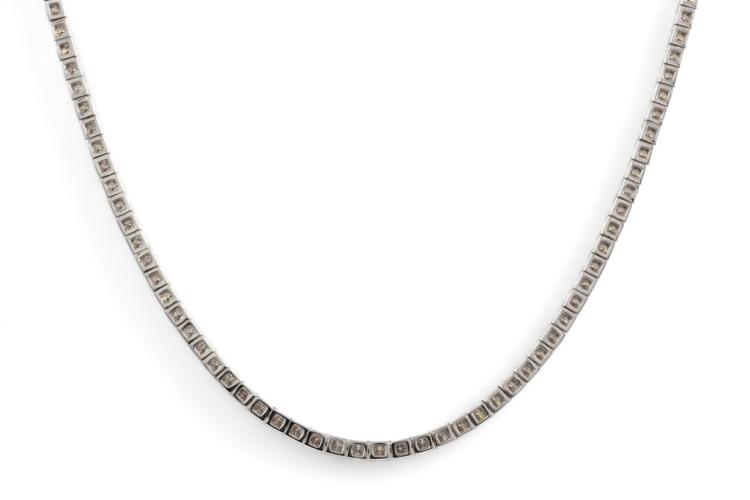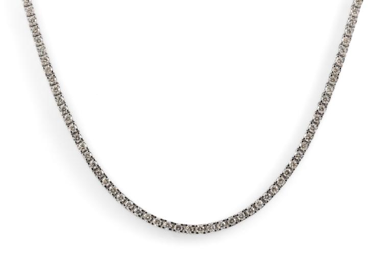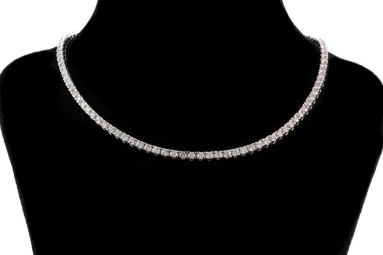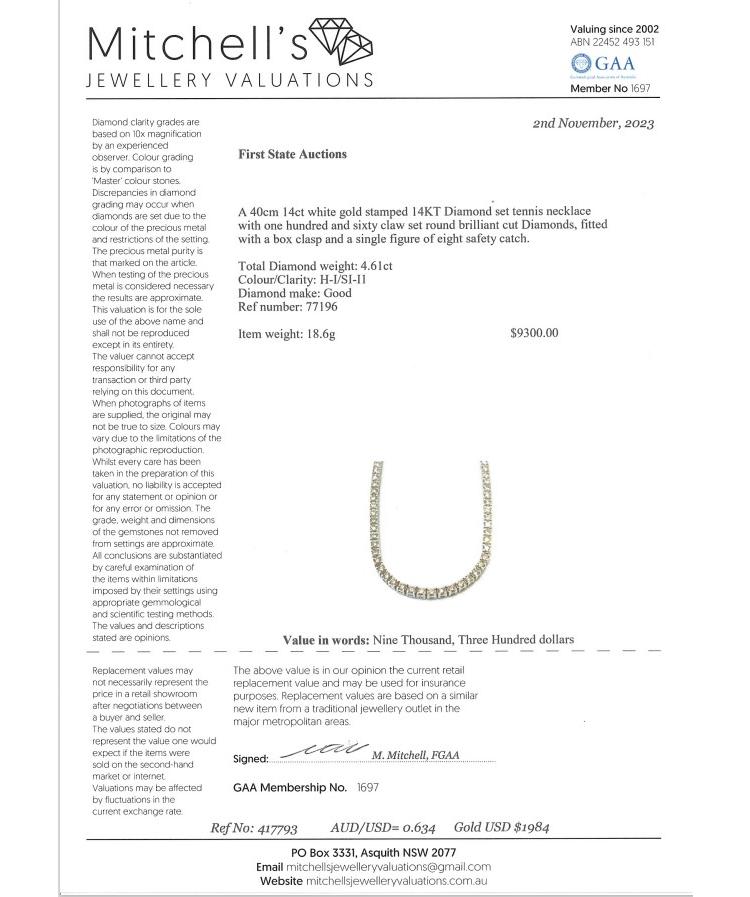 Diamond tennis necklace with 160 round shape Natural Diamonds totalling 4.61ct (Estimated grading: H-I SI-P1). 14ct white gold. Length: 40cm. Weight: 18.6g. With Valuation Certificate #417793. (New)