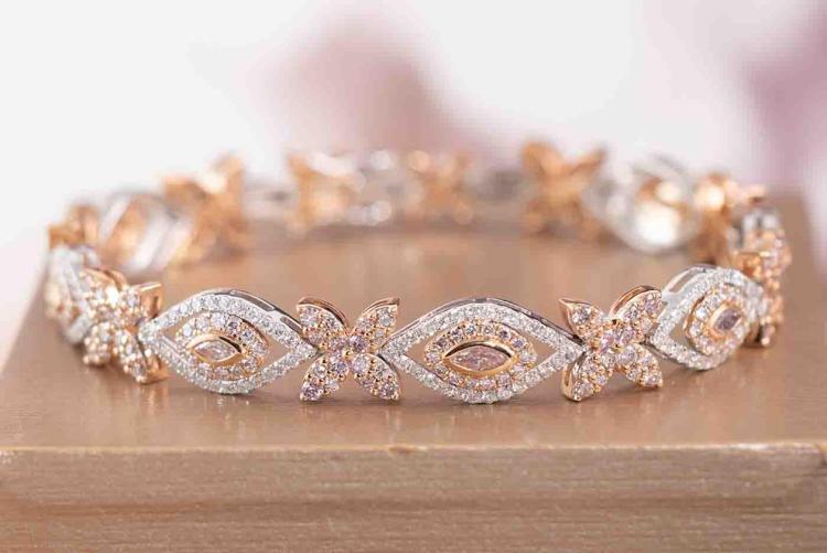 Diamond bracelet with marquise cut pink natural Diamonds totalling 0.38ct (Estimated grading: Fancy Light Pink SI) and round natural Diamonds totalling 4.48ct (Estimated grading: Fancy Light Pink & H-I SI-P1). 18ct rose and white gold. Length: 18cm. Weight: 20.6g. With Certificate #417407. (As new)