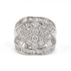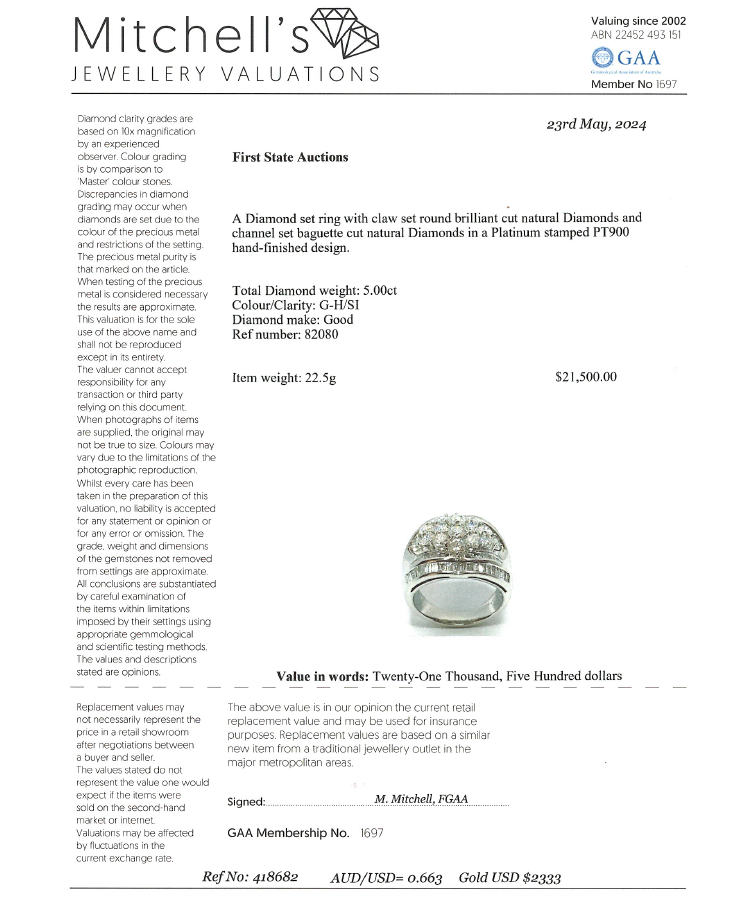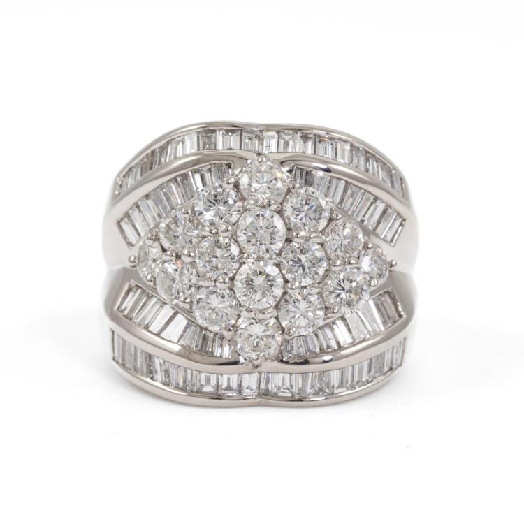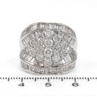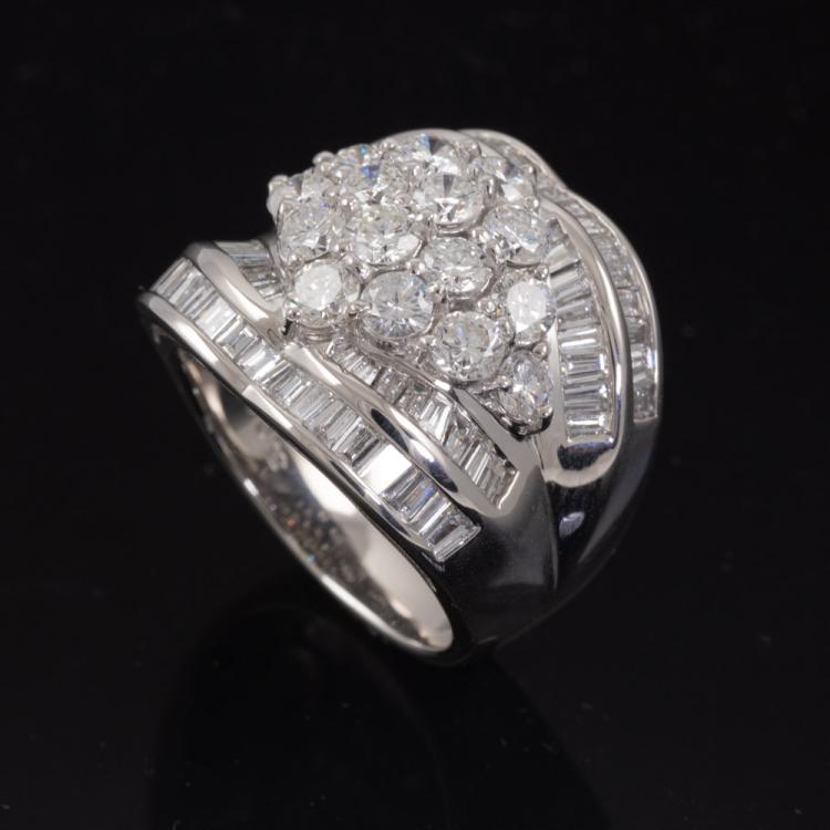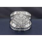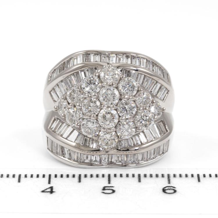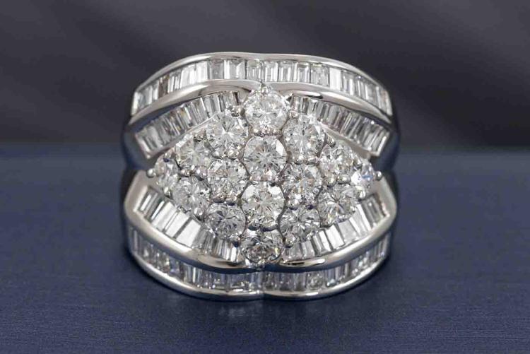 Diamond dress ring set with round & baguette cut natural Diamonds totalling 5.00ct (Estimated grading G-H SI). Platinum 900. Ring Size P. Band width: 4.4mm - 9.2mm. Weight: 22.5g. With Valuation Certificate #418682. (Pre-owned)