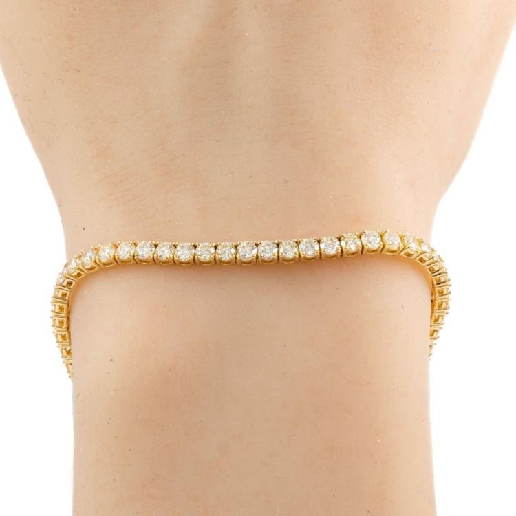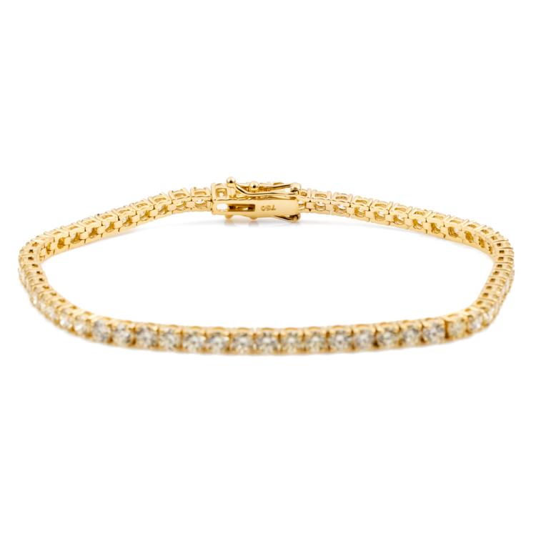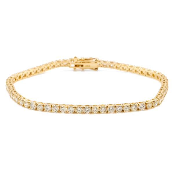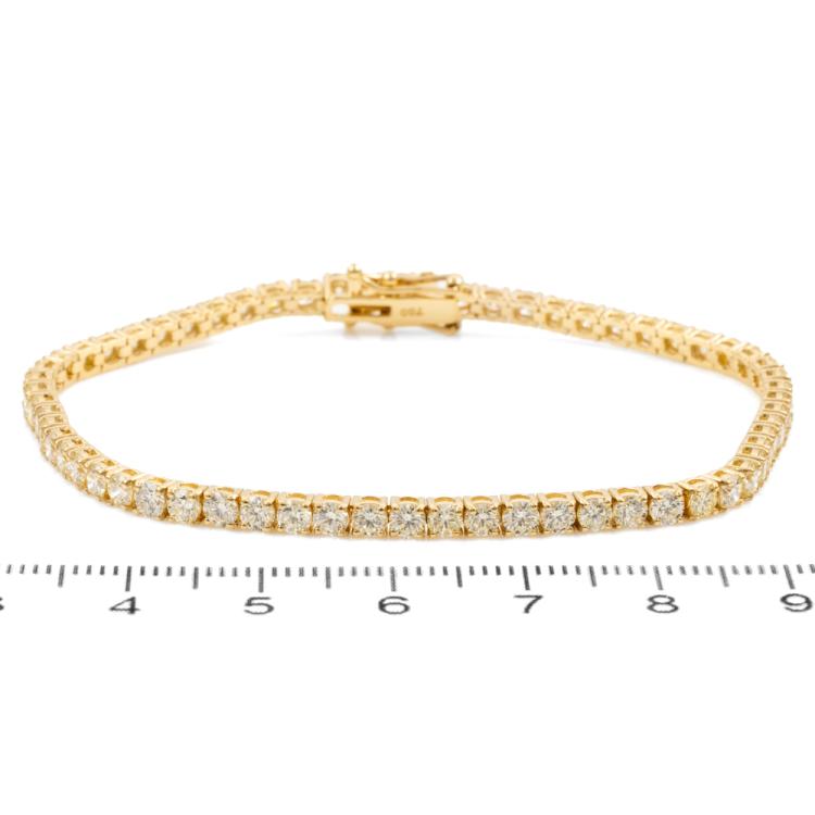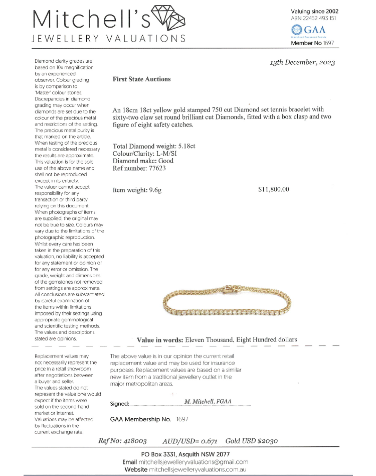 Diamond tennis bracelet with 62 round brilliant cut Natural Diamonds totalling 5.18ct. (Estimated grading: L-M SI). 18ct yellow gold. Length: 18cm. Weight: 9.6g. With Valuation Certificate #418003. (New)
