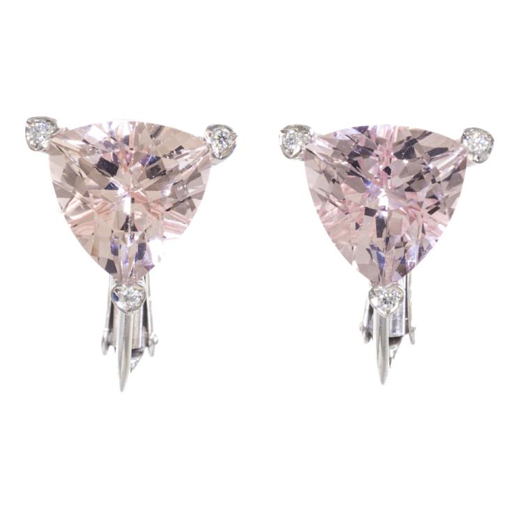 Morganite and Diamond clip-on earrings (for non pierced ears) with 2 trilliant cut natural Morganites totalling 5.18ct and round natural Diamonds totalling 0.04ct. Platinum-800/850 (XRF tested, stamped Pt900). Weight 6.7g. (Pre-owned)