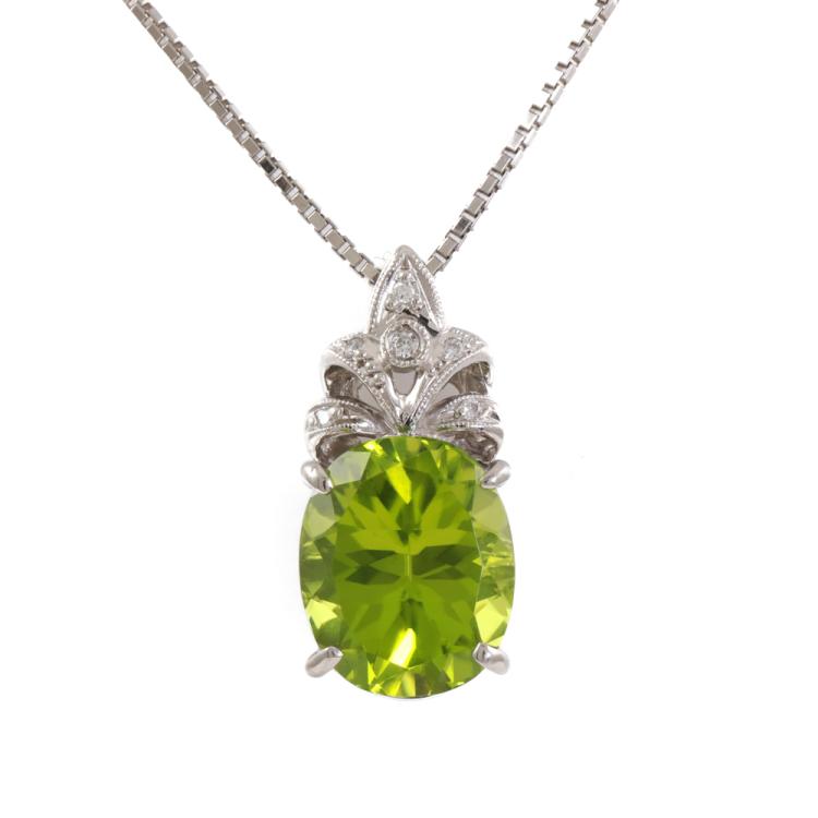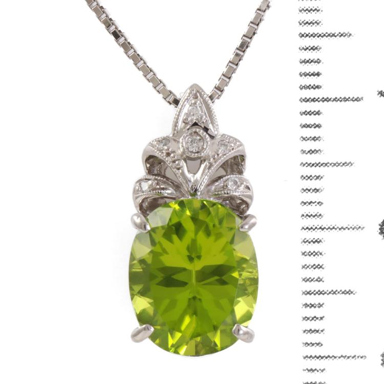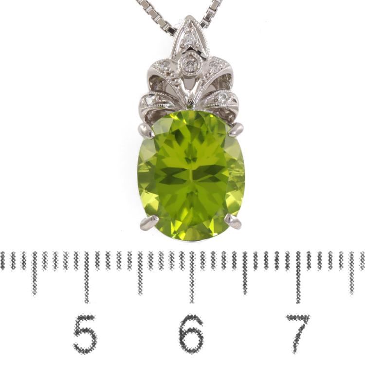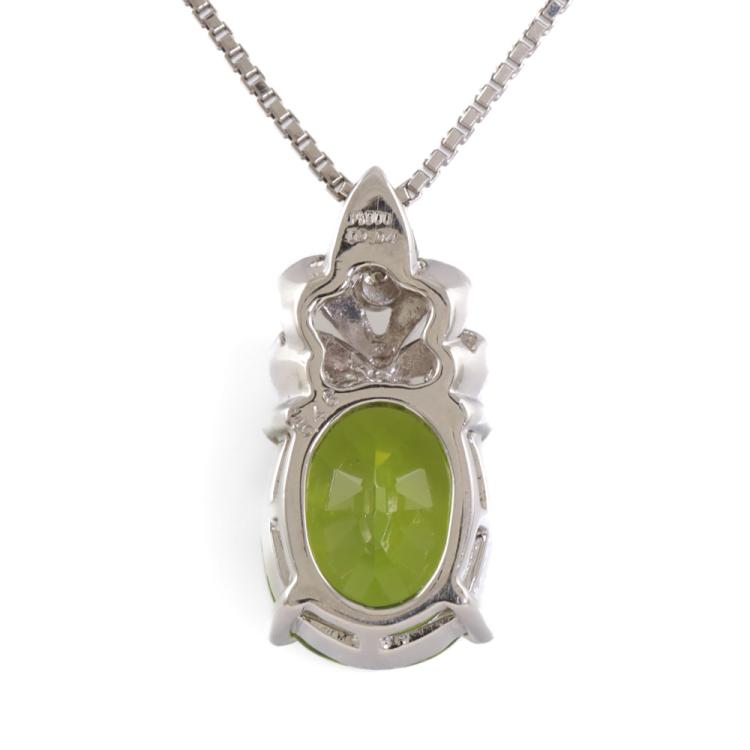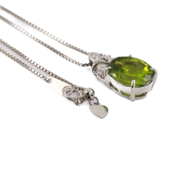Peridot and Diamond pendant with oval shape natural Peridot of 5.46ct and round natural Diamonds totalling 0.04ct. Platinum 900 with platinum 850 adjustable 45cm chain. Weight: 9.2g (Pre-owned)