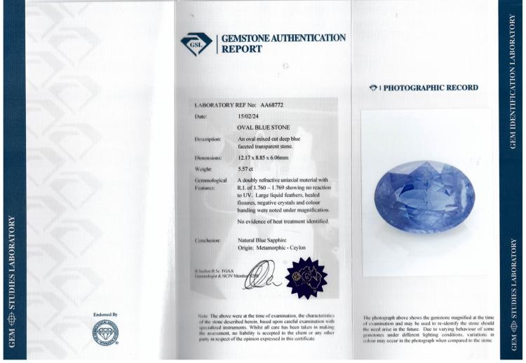 A loose oval shape unheated deep blue Ceylon Natural Sapphire of 5.57ct (with GSL report #AA68772). (As new)