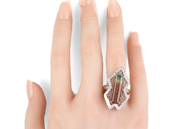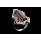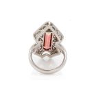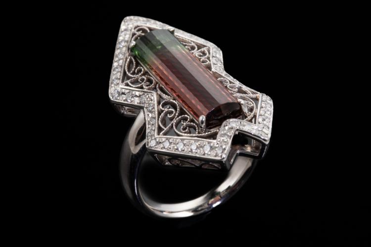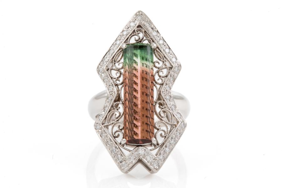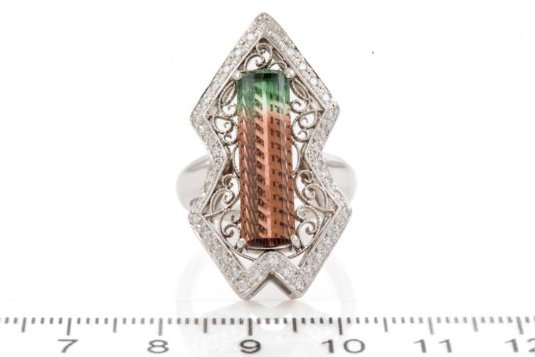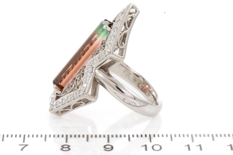 Tourmaline and Diamond ring with a rectangular Natural Watermelon Tourmaline of 5.78ct (27.50mm x 6.00mm) and round Natural Diamonds totalling 0.36ct (Estimated grading: G-H SI). Platinum 900. Ring size N1/2. Band width: 3.87mm x 3.45mm. Weight: 15.9g. (Pre-owned)