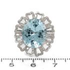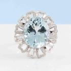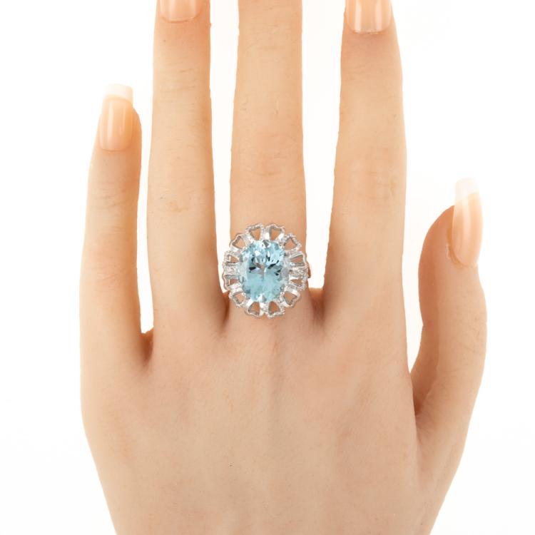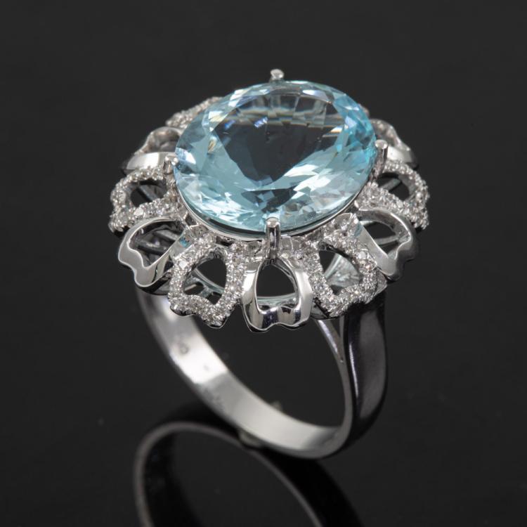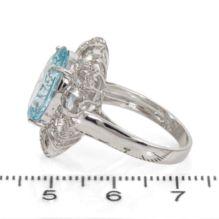 Aquamarine and Diamond ring with an oval shape natural Aquamarine of approximately 6.50ct and round natural Diamonds totalling 0.75ct (Estimated grading: I-J SI). 18ct white gold. Ring size M1/2. Band width: 3.1mm - 3.7mm. Weight: 6.9g. With Certificate #418659 (Pre-owned)