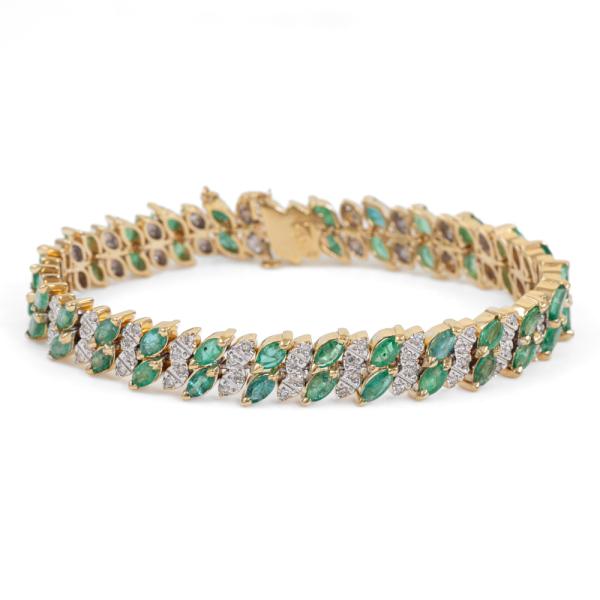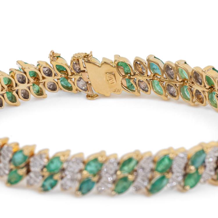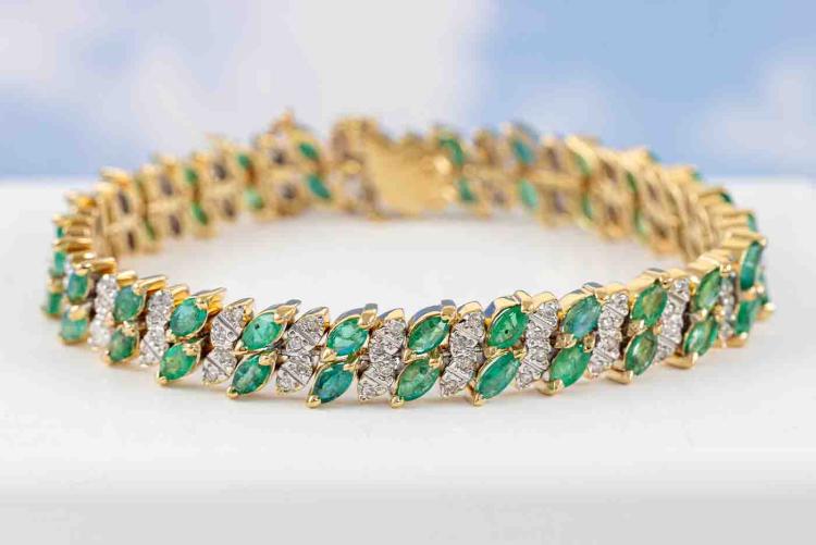 Emerald and Diamond bracelet with marquise cut natural Emerald totalling 6.50ct and round natural Diamonds totalling 0.50ct (Estimated grading: I-J SI). 18ct yellow gold. Length: 16cm. Weight: 26.6g. With Certificate #418694. (Pre-Owned)