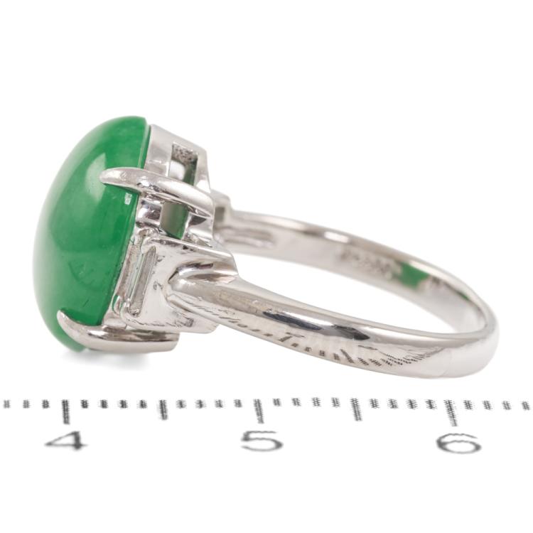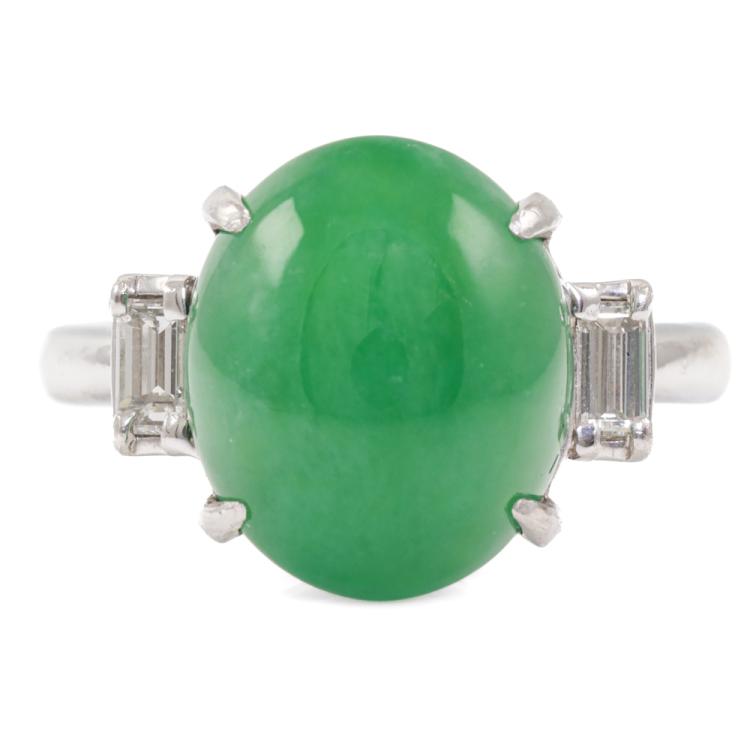Jade and Diamond ring with oval Cabochon cut Natural Jadeite Jade - Type A of 6.95ct and 2 baguette cut Natural Diamonds totalling 0.29ct. Platinum - 900. Ring size: L1/2. Band width: 2.3mm. Weight: 6.6g. (Pre-owned)