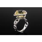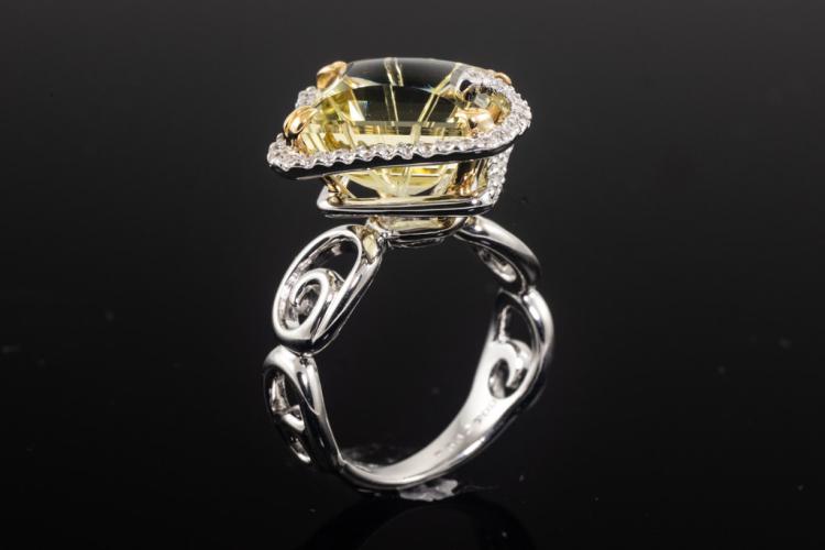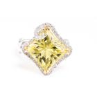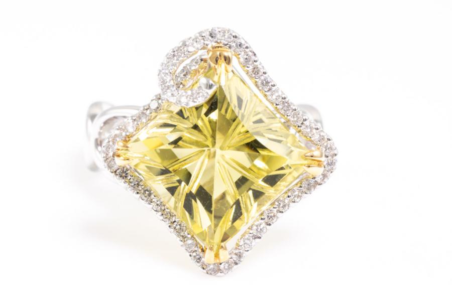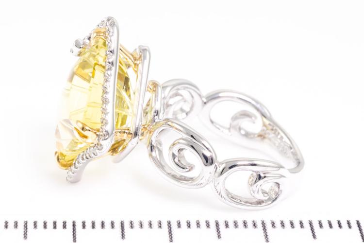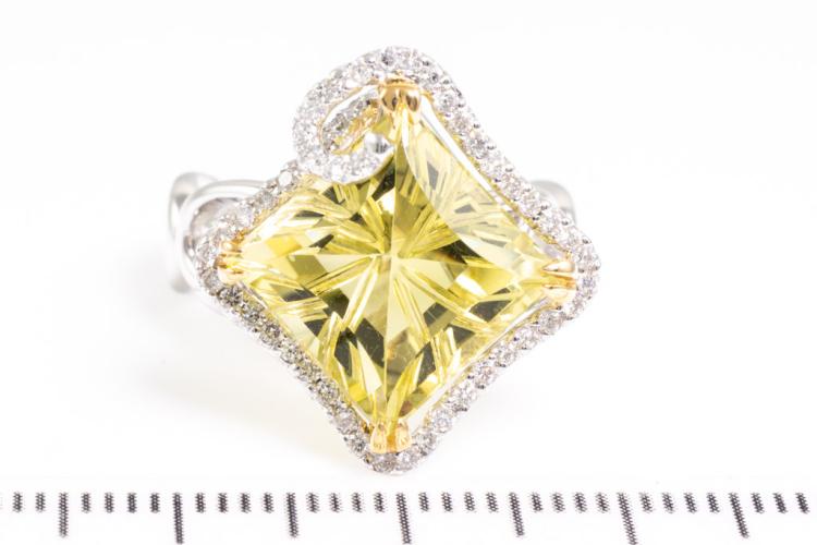 Quartz and Diamond ring with square shape Lemon Natural Quartz of 7.00ct and round Natural Diamonds totalling 0.32ct (Estimated grading: G SI). 18ct white gold. Ring size K. Weight: 7.7g. (Pre-owned)