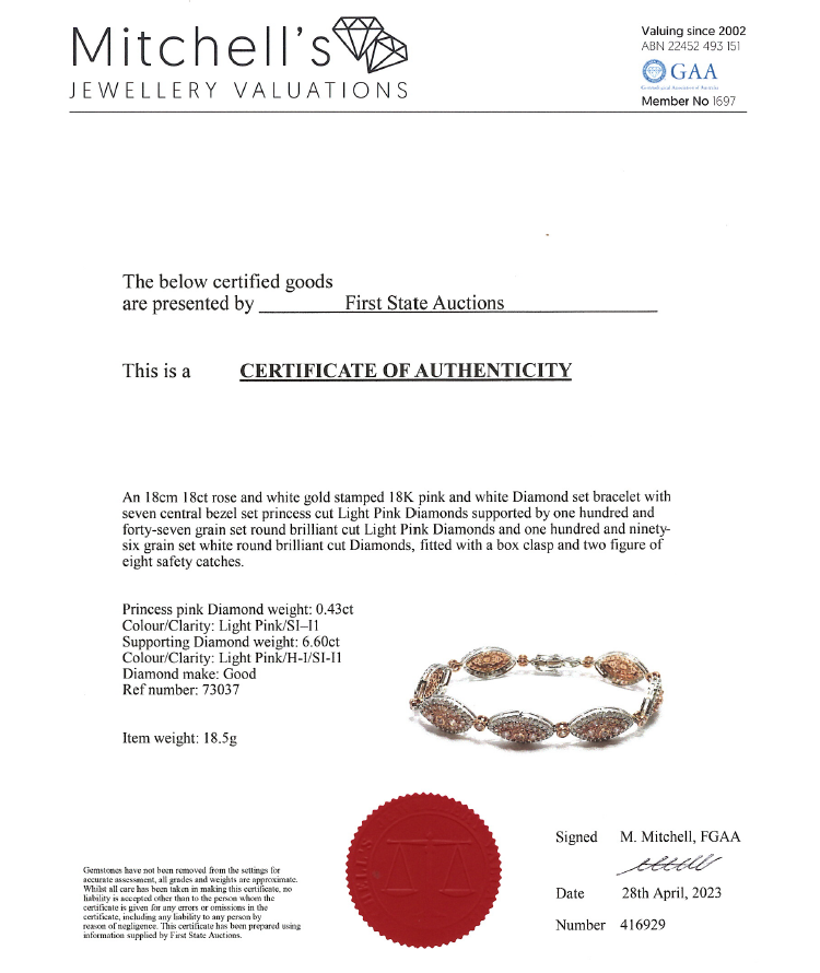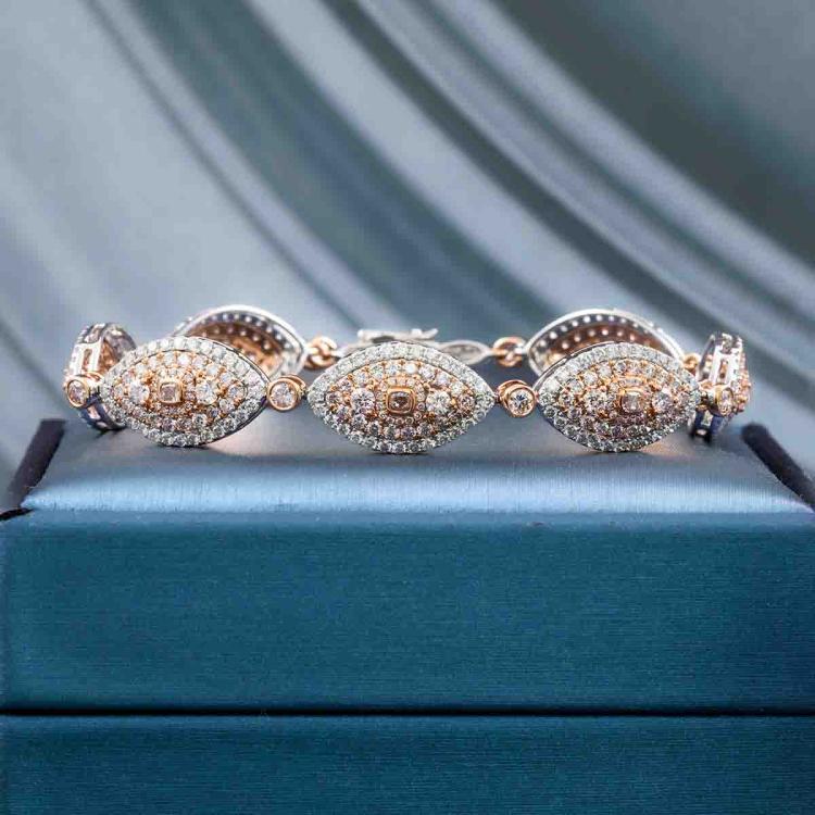 Diamond bracelet with princess cut pink Natural Diamonds totalling 0.43ct (Estimated grading: Light Pink SI-P1) and round Natural Diamonds totalling 6.60ct (Estimated grading: Light Pink & H-I SI-P1). 18ct rose and white gold. Length: 18cm. Weight: 18.5g. With Certificate #416929. (As new)