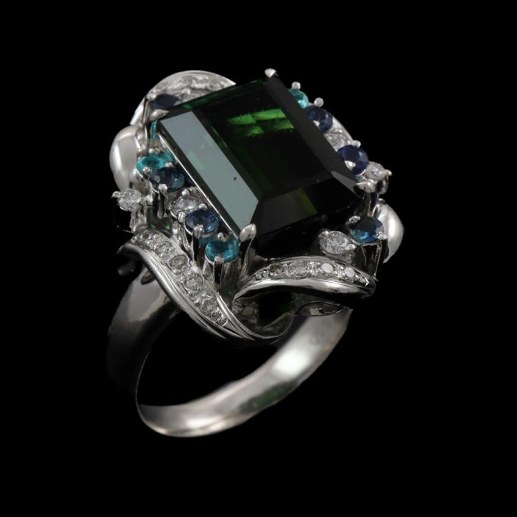 Tourmaline, Paraiba, Sapphire and Diamond ring with emerald cut green Natural Tourmalines of 7.06ct, round Natural Paraiba Tourmalines of 0.16ct, round blue Natural Sapphires 0.42ct and round Natural Diamonds totalling 0.45ct (Estimated grading: H & J SI). Platinum - 900. Ring size: O1/2. Band Width: 3.3mm - 4.0mm. Weight: 16.6g. (Pre-owned)