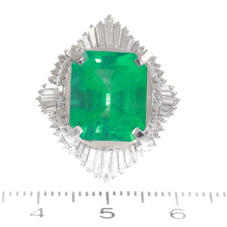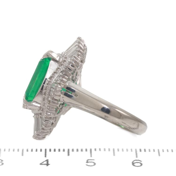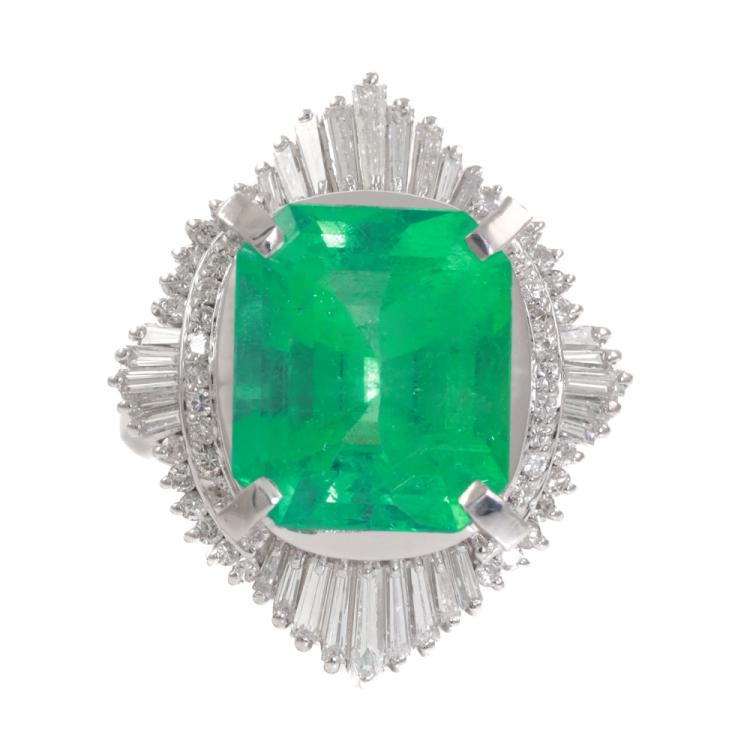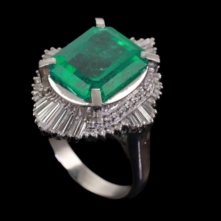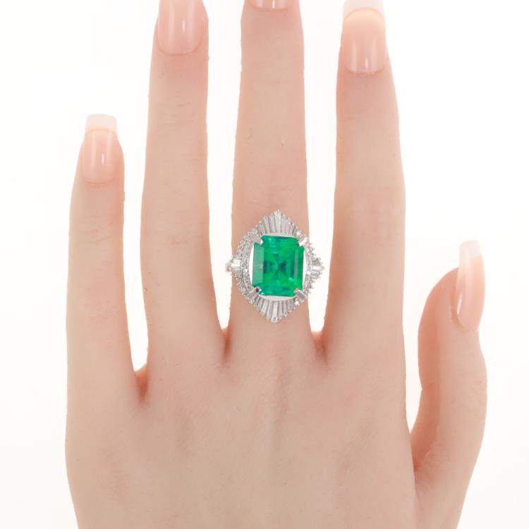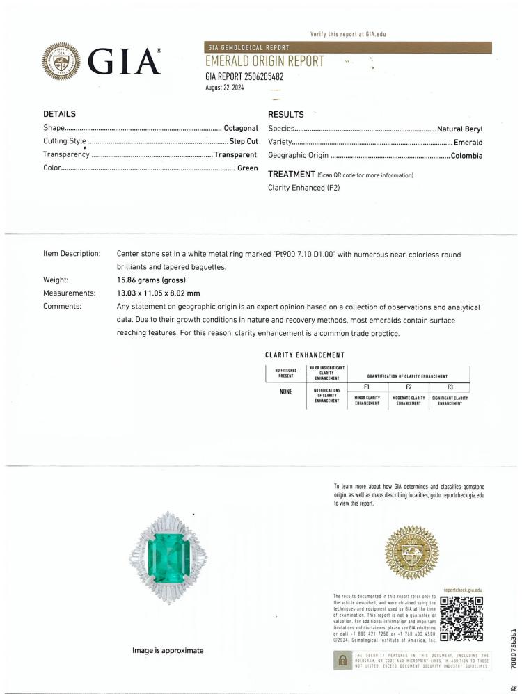 Emerald and Diamond ring with emerald cut Natural Colombian Emerald of 7.10ct (With GIA Origin Report #2506205482. Origin: Columbian) and round & baguette cut Natural Diamonds totalling 1.00ct (Estimated grading: G-H VS-SI). Platinum 900. Ring size M. Band width: 3.2mm - 3.5mm. Weight: 15.8g. (Pre-owned)
