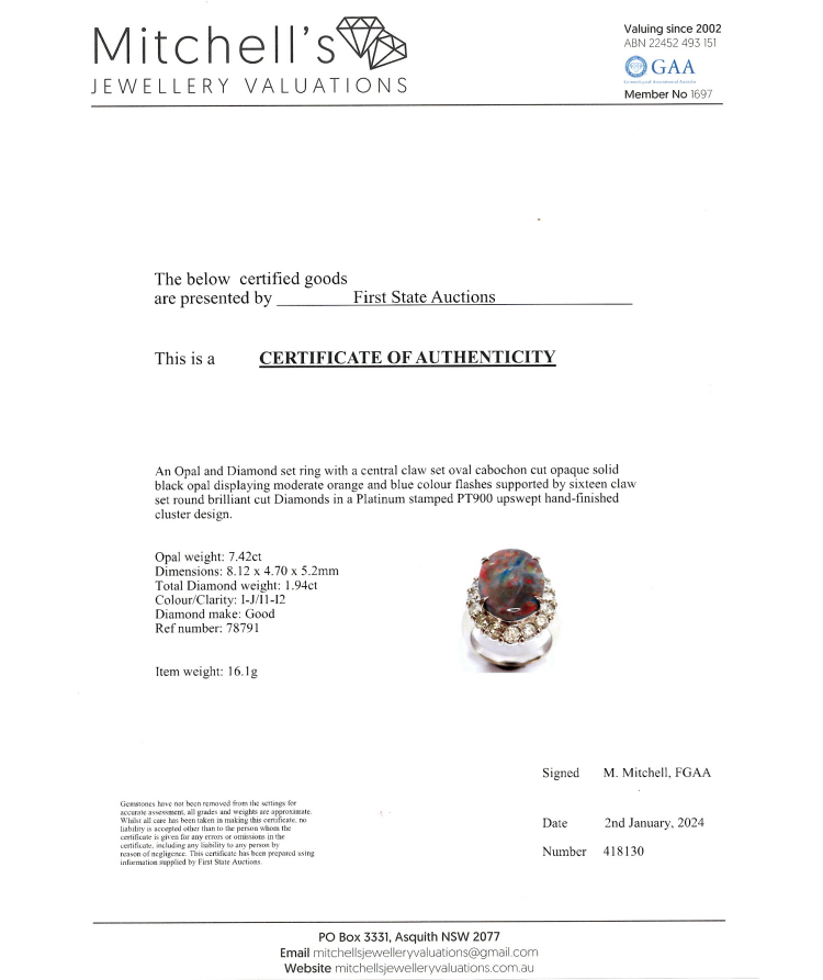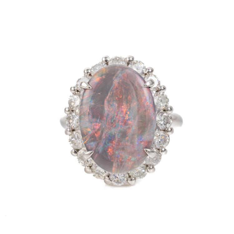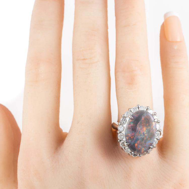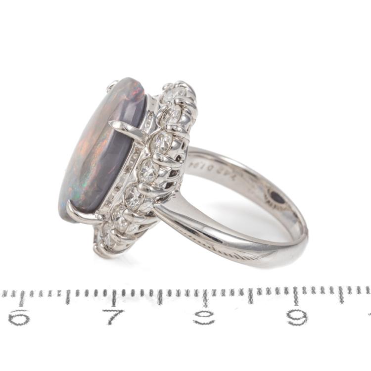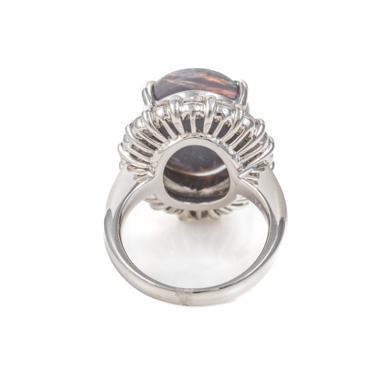 Opal and Diamond ring with solid black Opal of 7.42ct and round Natural Diamonds totalling 1.94ct (Estimated grading: I-J I1-I2). Platinum-900. Ring size L. Weight: 16.1g. With Certificate #418130. (Pre-owned)