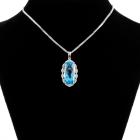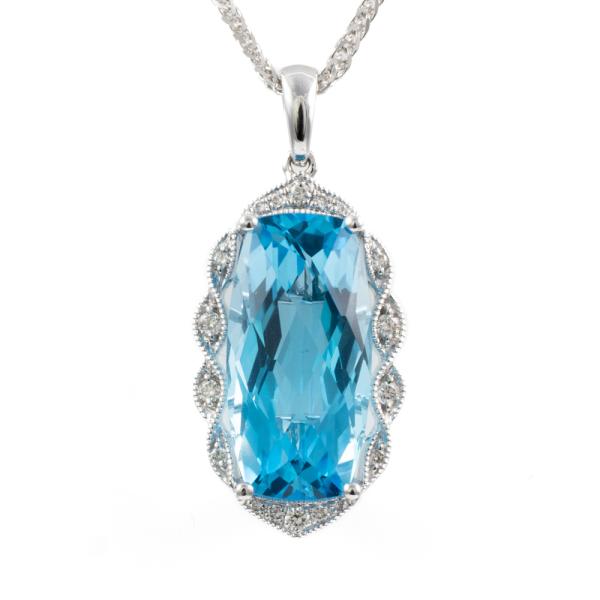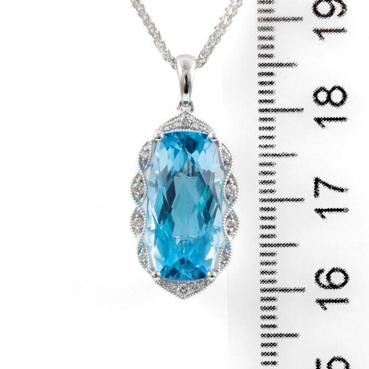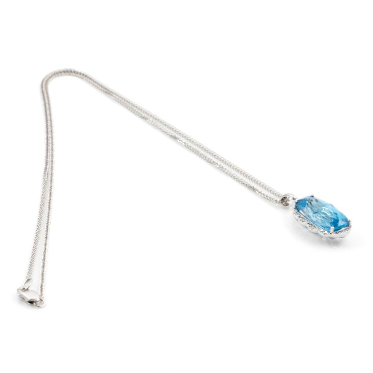 Topaz and Diamond pendant with rectangular cushion blue natural Topaz totalling 7.59ct (16.2mm x 8.2mm) and natural Diamonds totalling 0.12ct. 14ct white gold with 18ct white gold 45cm chain. Weight: 6.3g. (New)