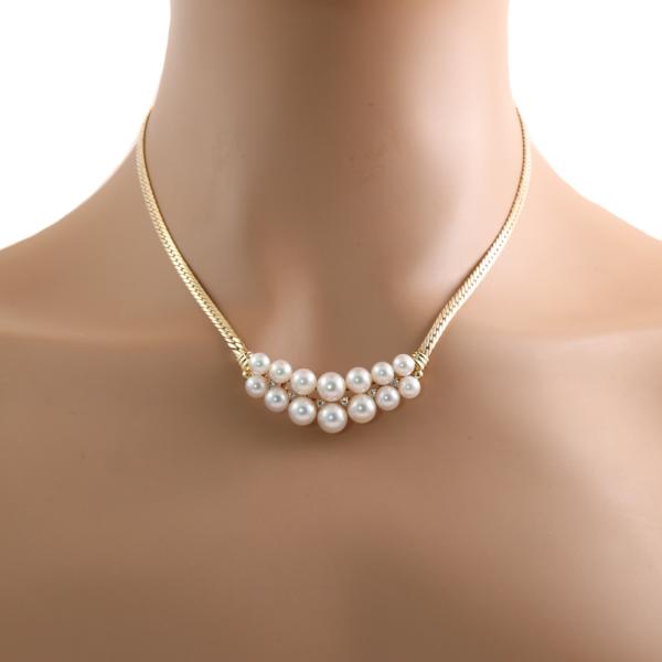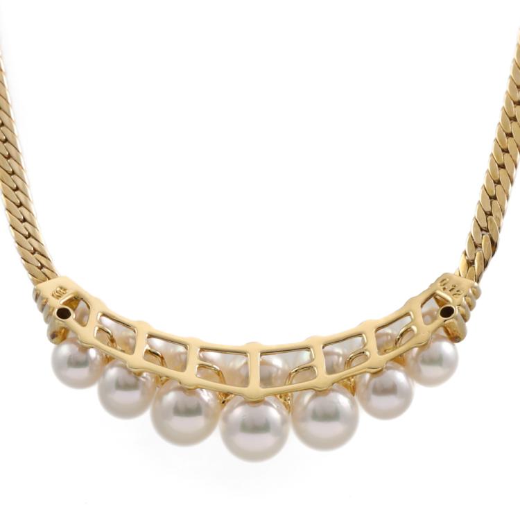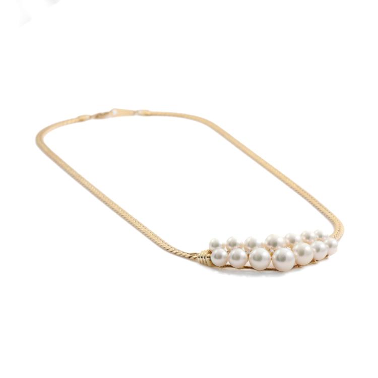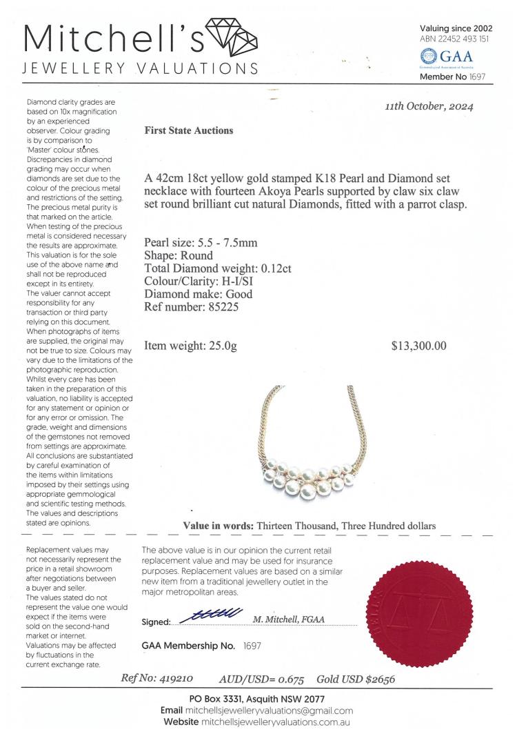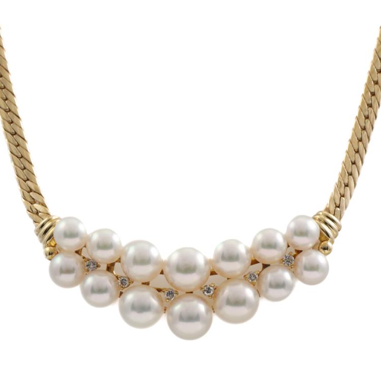 Pearl and Diamond necklace with 14 round Akoya Pearls of 5.5mm - 7.5mm and round Natural Diamonds totalling 0.12ct (Estimated grading: H-I SI) with 18ct yellow gold chain attached. Length 42.0cm. Weight: 25.0g. With Certificate #419210. (Pre-owned)