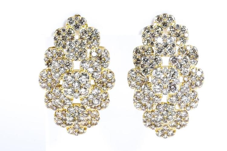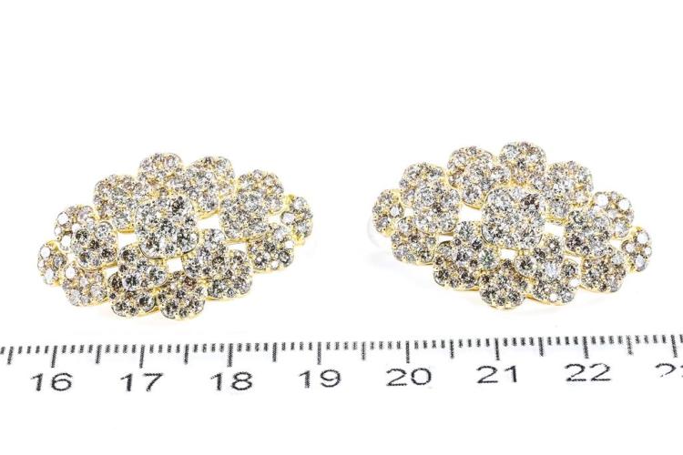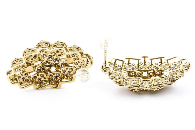 Diamond dress earrings with round Natural Diamonds totalling 8.00ct (Estimated grading: M-N SI). 18ct yellow gold with 18ct yellow gold and silicon backs. Weight: 11.1g. With Certificate #415853. (Pre-owned)