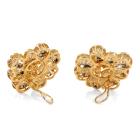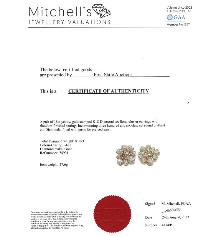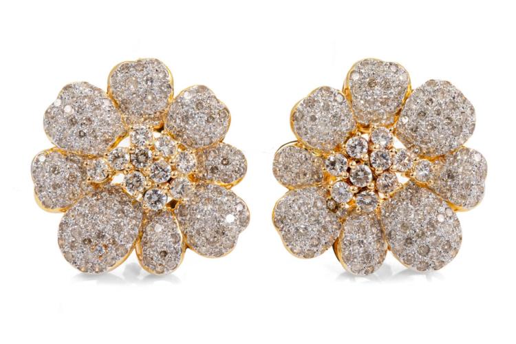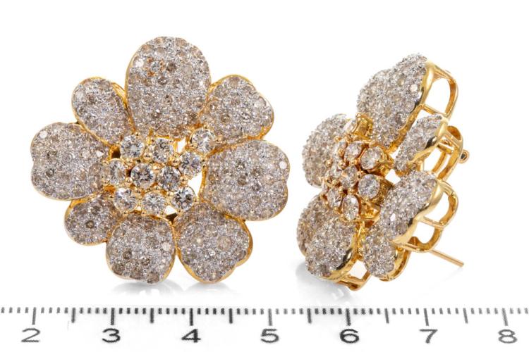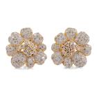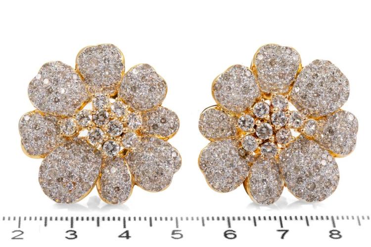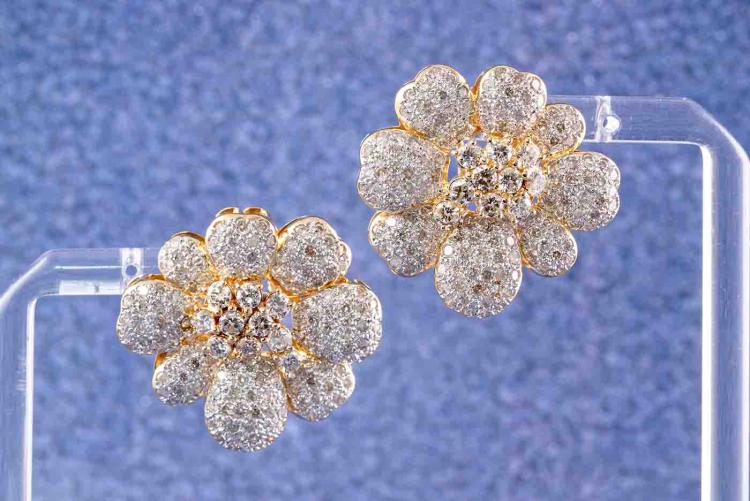 Diamond floral design clip-on earrings (for pierced ears) with round Diamonds totalling 8.08ct (Estimated grading: I-J P1). 18ct yellow gold with white rhodium plating. Weight: 27.6g. With Certificate #417405. (Pre-owned)