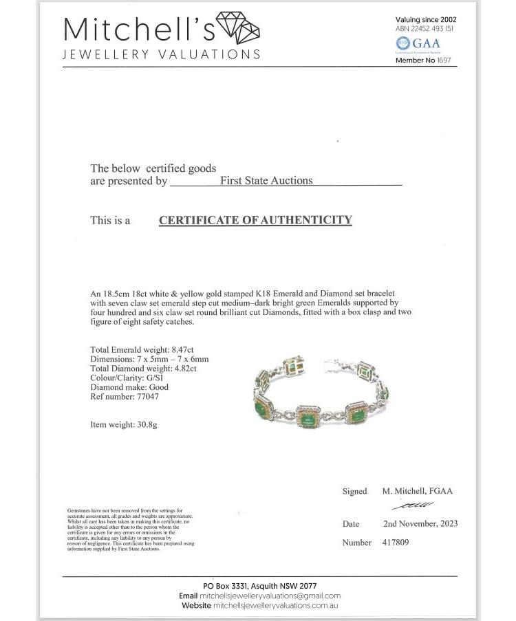 Emerald and Diamond bracelet with Natural Emerald totalling 8.47ct and Natural Diamonds totalling 4.82ct (Estimated grading: G SI). 18ct yellow gold and white gold. Length: 18.5cm. Weight: 30.8g. With Valuation Certificate #417809. (Pre-owned)