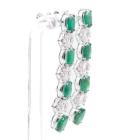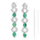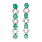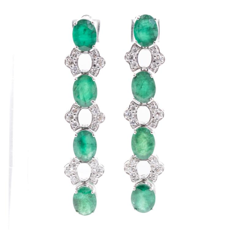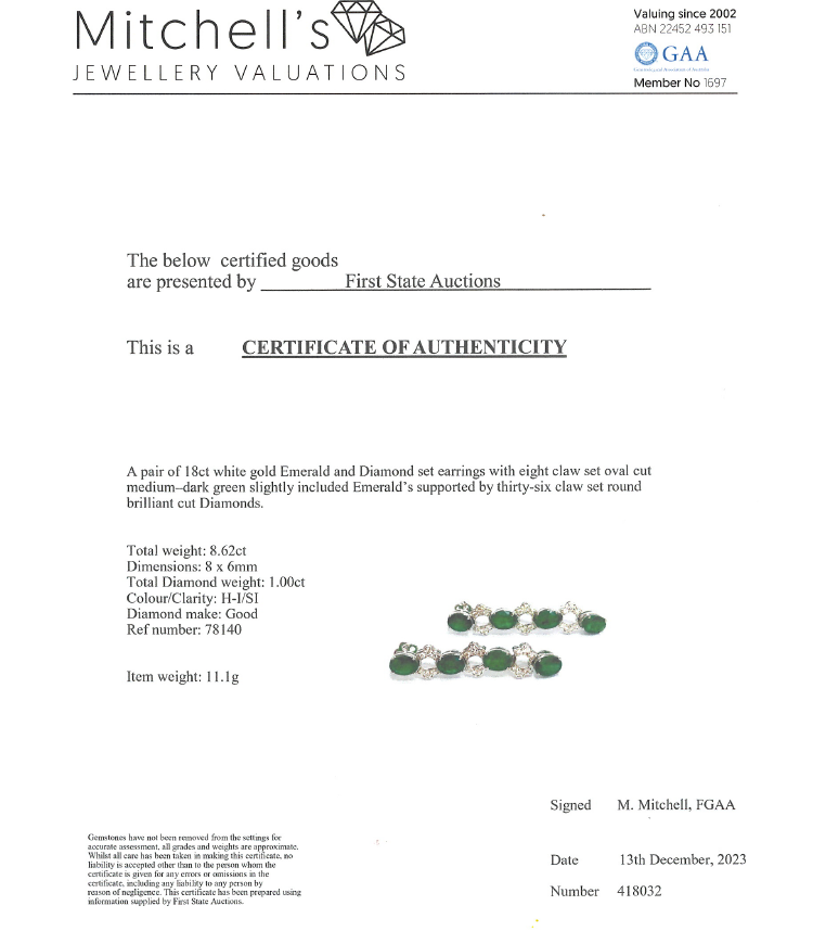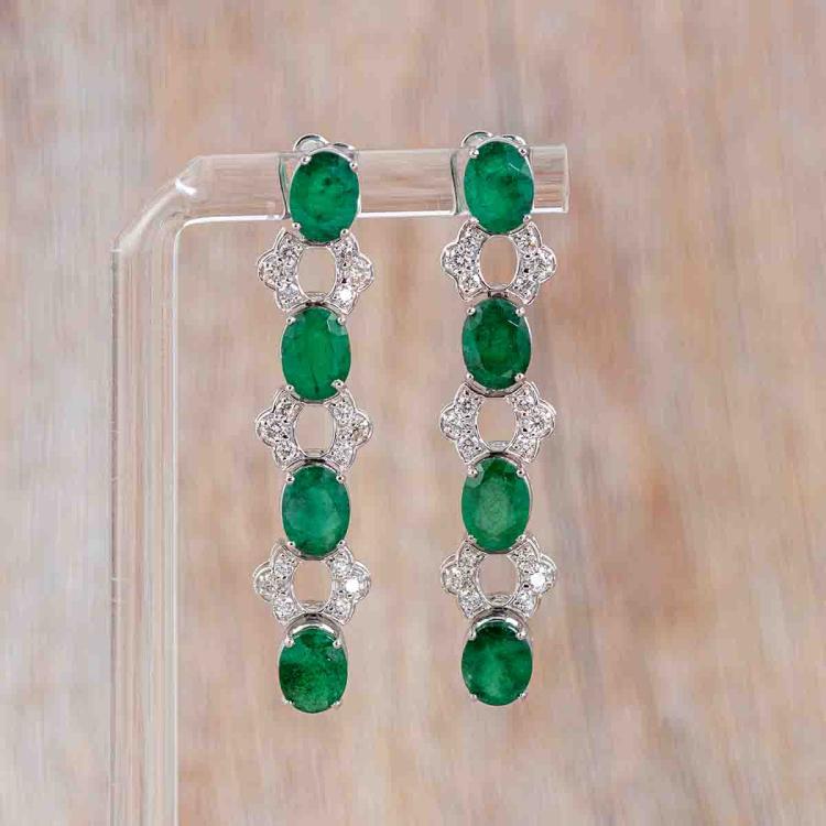 Emerald and Diamond drop earrings with oval Natural Emerald totalling 8.62cts and round Natural Diamonds totalling 1.00cts (Estimated grading: H-I SI). Length: 48mm. 18ct white gold. Weight: 11.1g. With Certificate #418032.(Pre-owned)