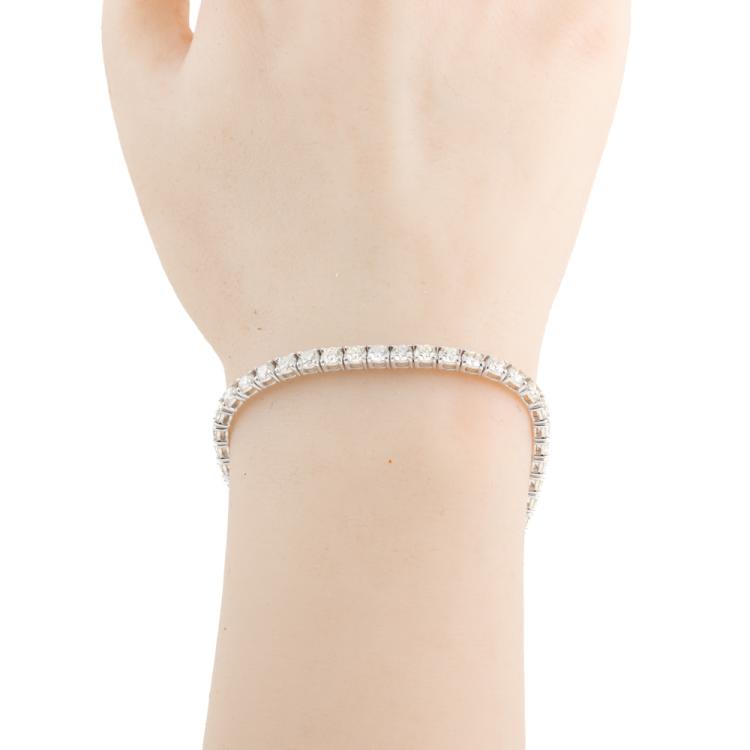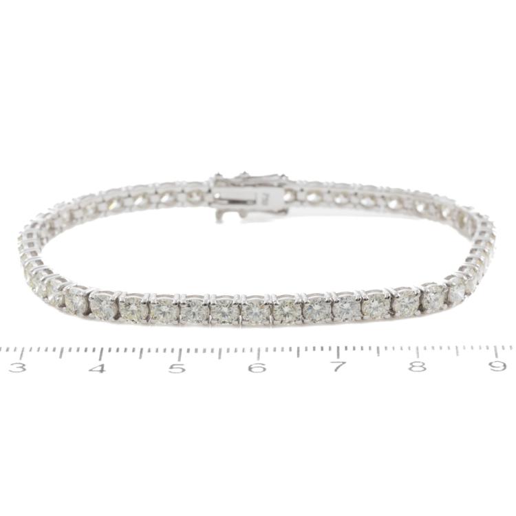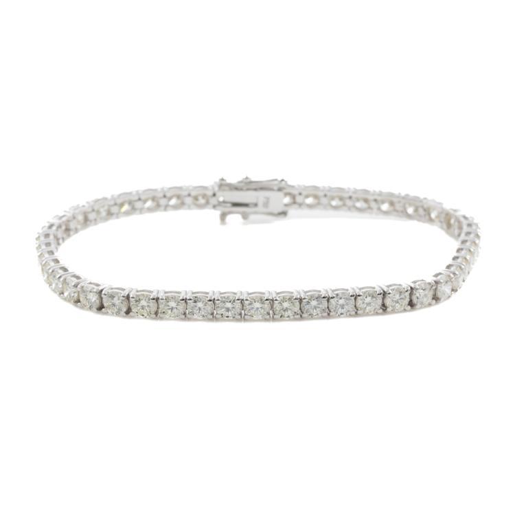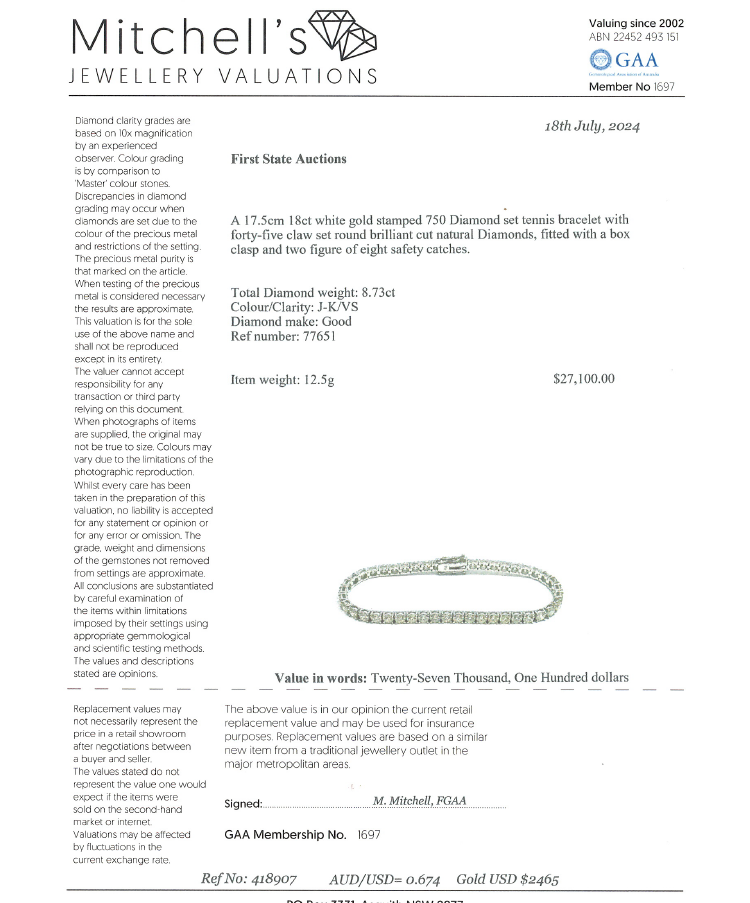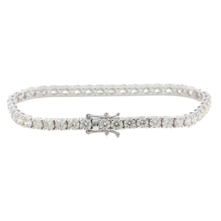 Diamond tennis bracelet with 45 round brilliant cut Natural Diamonds totalling 8.73ct. (Estimated grading: J-K VS) 18ct white gold. Length: 17.5cm. Weight: 12.5g. With Valuation Certificate #418907. (New)