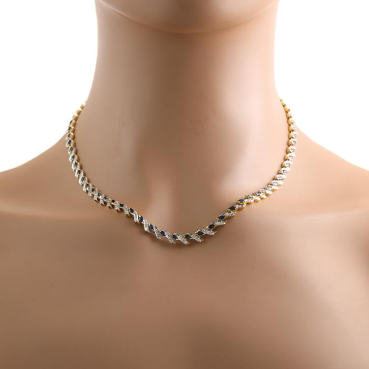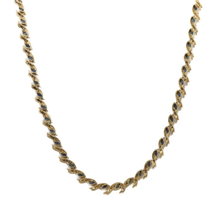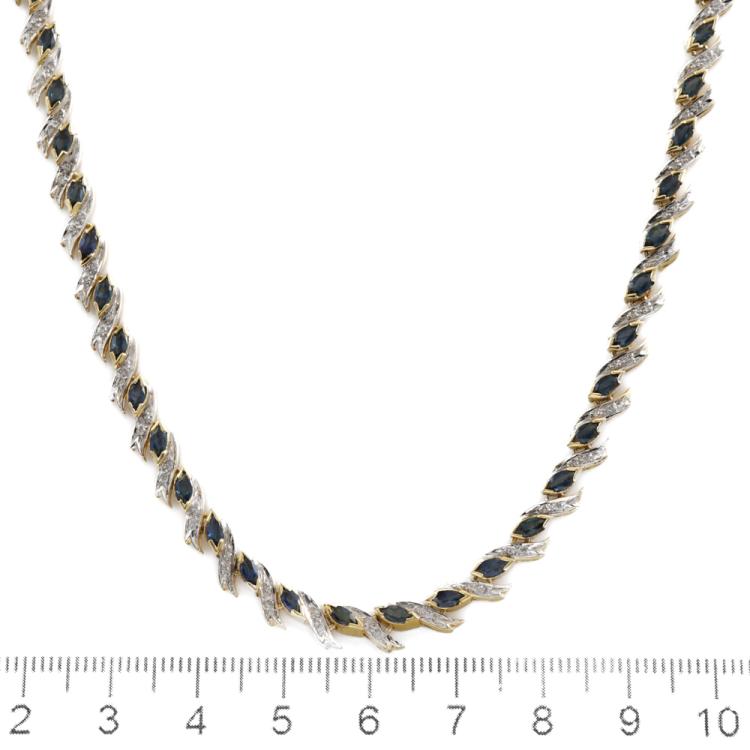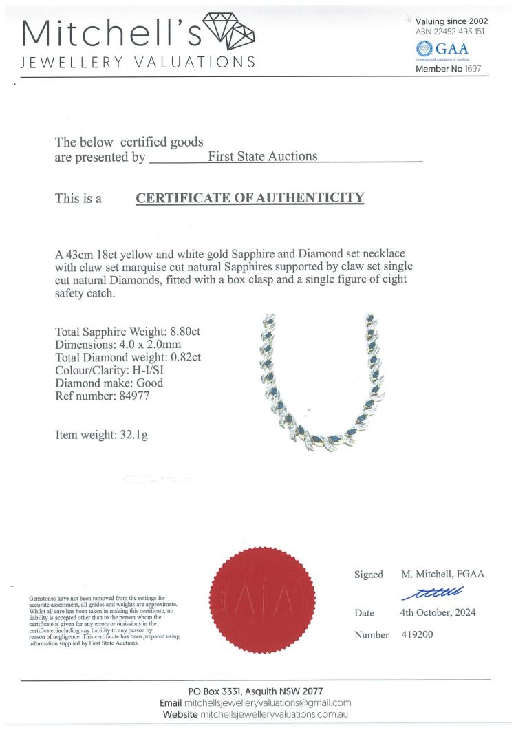 Sapphire and Diamond necklace with marquise cut Natural blue Sapphires totalling 8.80ct and round Natural Diamonds totalling 0.82ct (Estimated grading: H-I SI). 18ct yellow gold and white gold. Length: 43.0cm. Weight: 32.1g. With Certificate #419200. (Pre-owned)