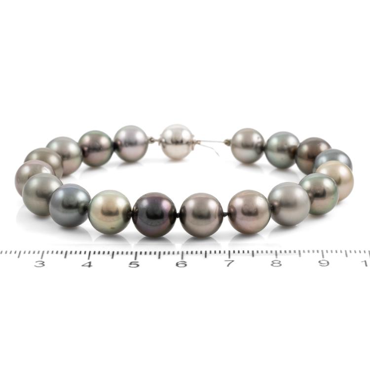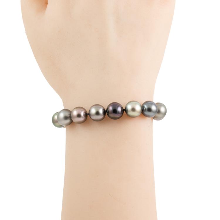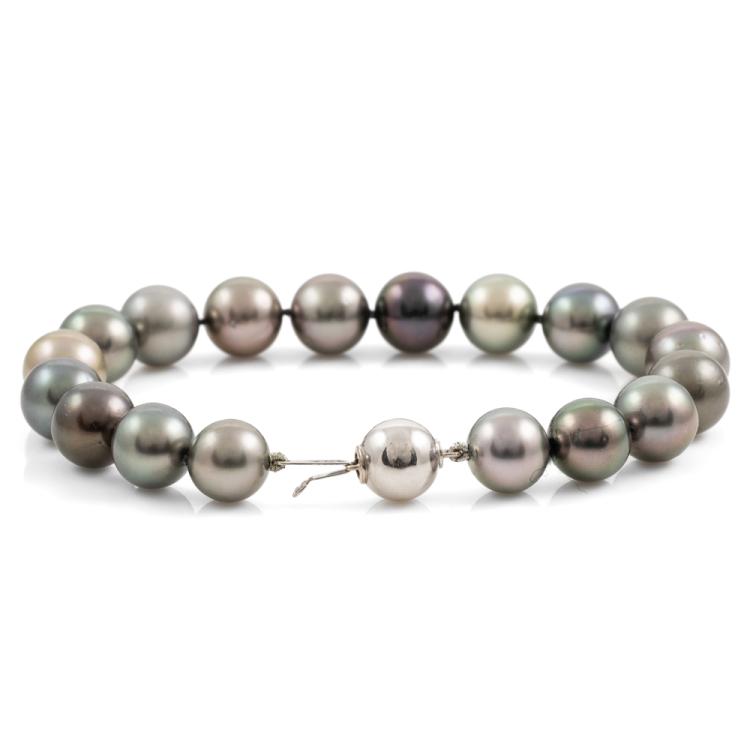 Pearl bracelet with Tahitian Pearls of 9mm-10mm. 9ct white gold ball clasp. Length: 19.5cm. Weight: 24.0g. (Pre-owned)